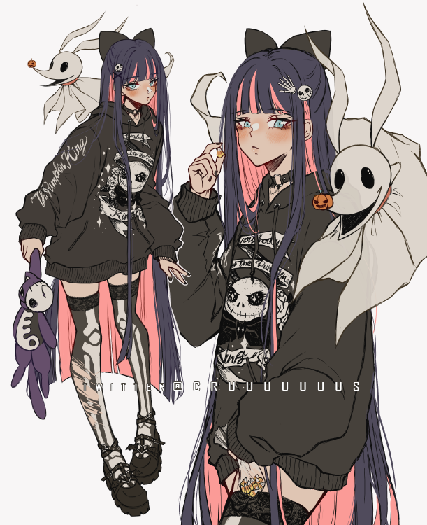 1girl alternate_costume artist_name black_bow black_choker black_hair black_hoodie black_nails black_thighhighs blush bow choker criis-chan food full_body ghost_costume grey_background grey_eyes hair_bow hair_ornament hand_up holding holding_food holding_stuffed_toy honekoneko_(psg) hood hood_down hoodie jack_skellington long_hair long_sleeves multicolored_hair multiple_views nail_polish o-ring o-ring_choker panty_&_stocking_with_garterbelt parted_lips pink_bow pink_hair puffy_long_sleeves puffy_sleeves purple_hair simple_background skull_print stocking_(psg) stuffed_animal stuffed_cat stuffed_toy teeth the_nightmare_before_christmas thighhighs zero_(nbc)
