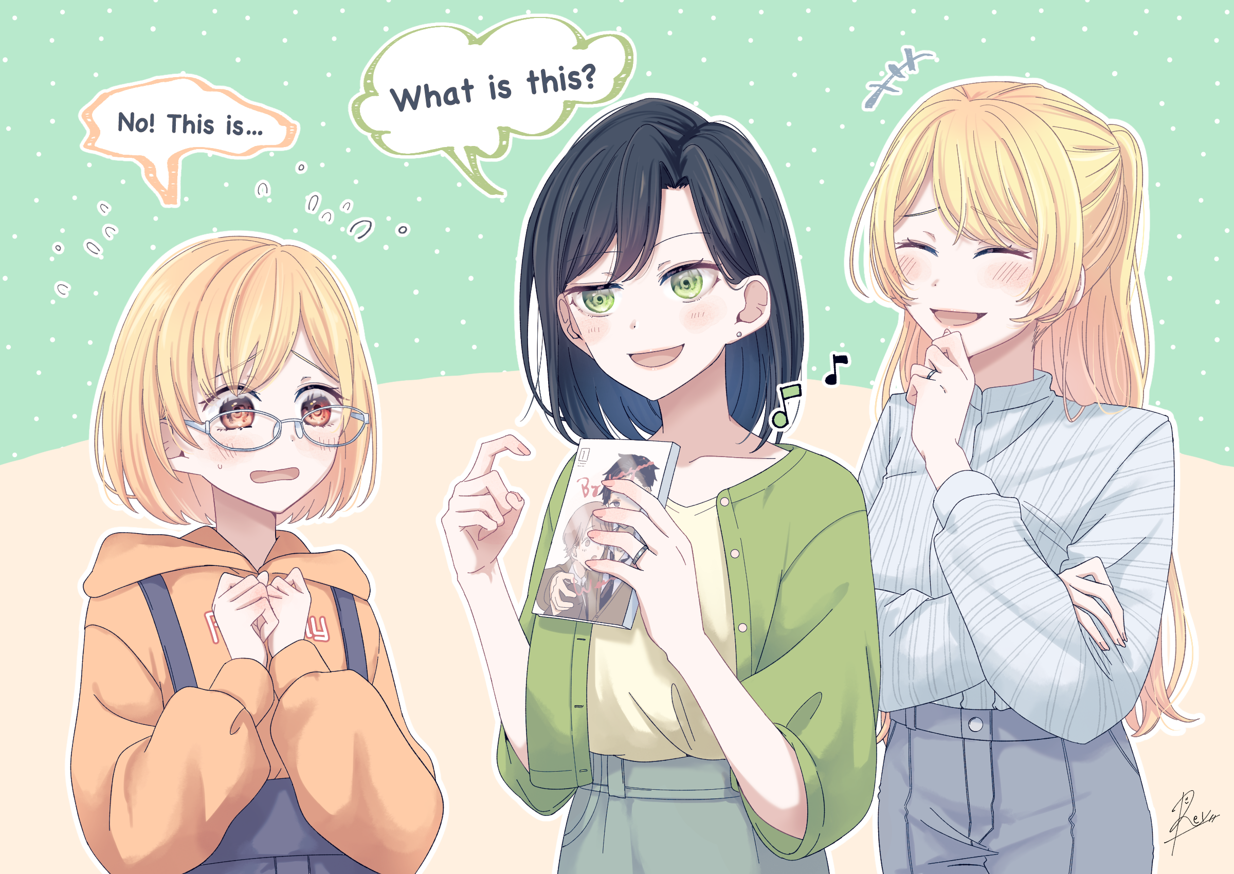 3girls black_hair blonde_hair brown_eyes english_text family fujoshi glasses green_eyes hand_on_own_chin highres irene_(ricky_barnes) jewelry long_hair maya_(ricky_barnes) mimi_(ricky_barnes) mother_and_child mother_and_daughter multiple_girls nervous original pale_skin parent_and_child pornography raised_eyebrow reyravi1024 ring short_hair wedding_ring wife_and_wife yaoi yaoi_(object) yuri