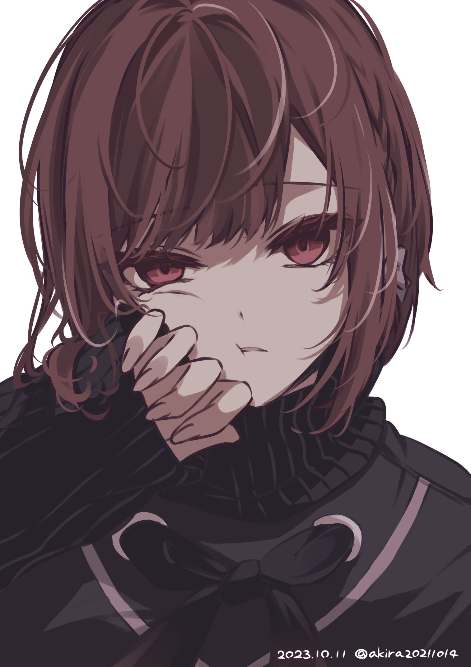 1girl akira20211014 black_sweater brown_eyes brown_hair dated highres long_sleeves looking_at_viewer parted_lips portrait project_sekai shinonome_ena short_hair sleeves_past_wrists solo sweater twitter_username white_background