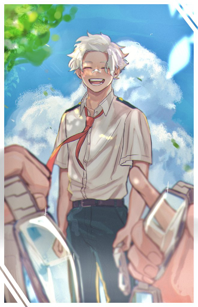 1boy arms_at_sides belt blue_sky boku_no_hero_academia brown_belt buttons closed_eyes cloud collared_shirt unworn_eyewear facing_viewer happy holding holding_removed_eyewear loud_cloud male_focus necktie open_mouth out_of_frame outdoors pov red_necktie shirt short_hair short_sleeves sky solo ton_(ton19130318) tree unworn_eyewear white_hair