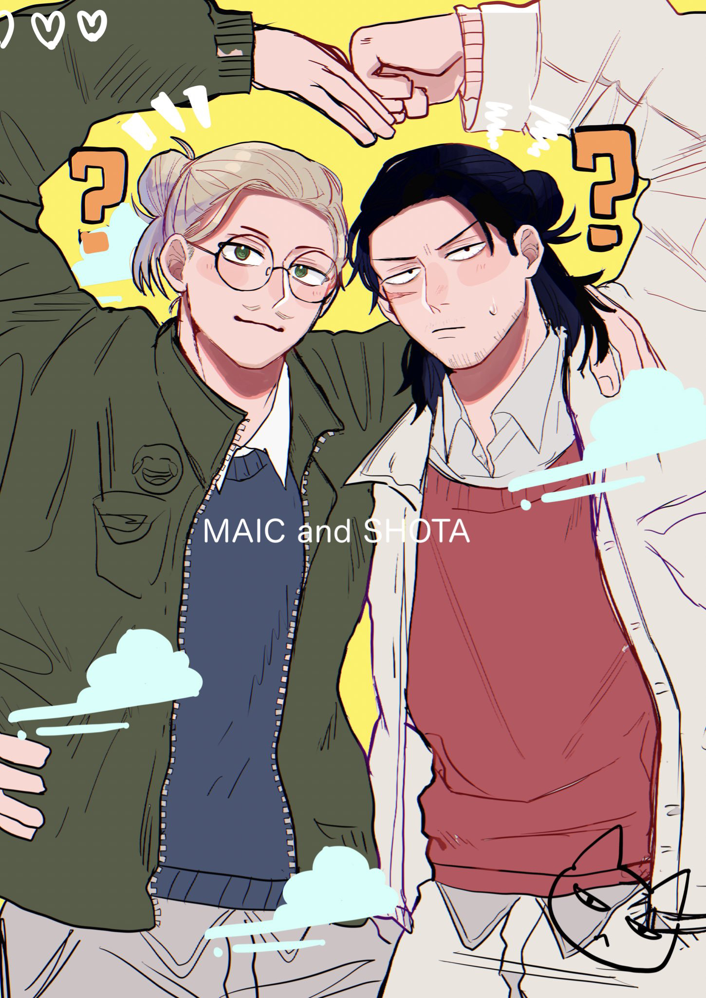 ? aizawa_shota arm_up black_eyes black_hair blue_sweater boku_no_hero_academia closed_mouth collared_shirt facial_hair green_eyes green_jacket grey_hair hair_bun hand_on_another's_shoulder heart heart_arms heart_arms_duo highres jacket long_sleeves looking_at_viewer mustache pants present_mic red_sweater round_eyewear scar shirt sparse_stubble sweater ton_(ton19130318) white_jacket white_pants white_shirt yaoi yellow_background