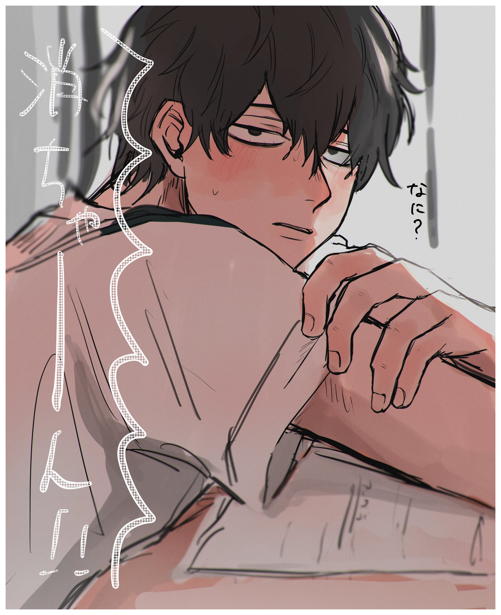 1boy aged_down bags_under_eyes black_eyes black_hair boku_no_hero_academia border aizawa_shota fingernails from_side hair_between_eyes highres leaning_on_table looking_at_viewer male_focus paper parted_lips shirt short_hair short_sleeves solo sweatdrop ton_(ton19130318) translation_request white_border white_shirt