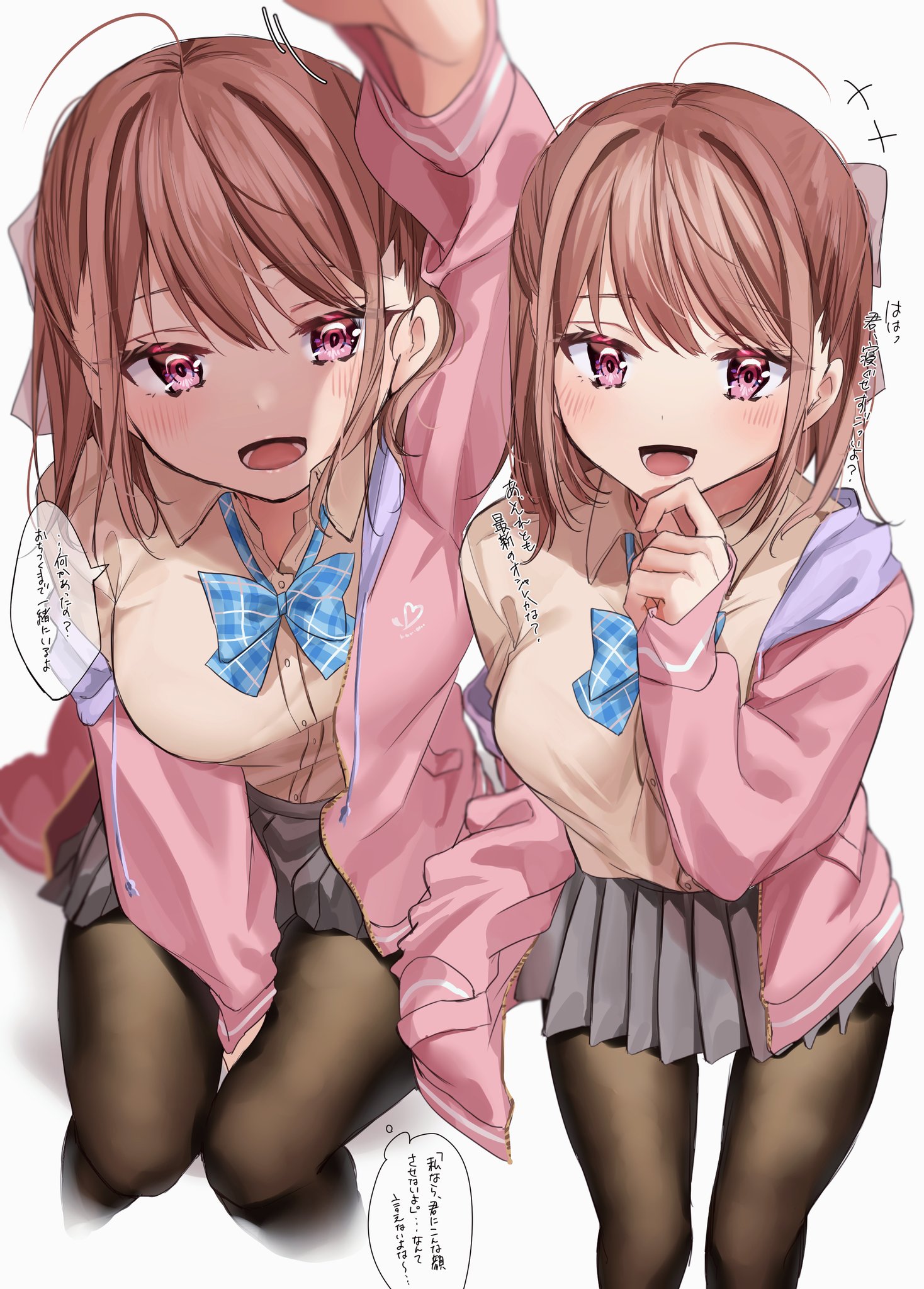 1girl ahoge black_pantyhose blue_bow blue_bowtie blush bow bowtie breasts brown_hair brown_shirt chigusa_minori collared_shirt commentary_request cowboy_shot cropped_legs dress_shirt finger_to_own_chin hair_between_eyes hair_bow highres hood hooded_jacket incoming_headpat invisible_chair jacket kokoro_iroduku_koi_ga_shitai large_breasts long_sleeves looking_at_viewer lower_teeth_only medium_hair momose_akari multiple_views open_clothes open_jacket open_mouth pantyhose pink_eyes pink_jacket plaid_bow plaid_bowtie plaid_clothes school_uniform shirt sidelocks simple_background single_off_shoulder sitting sleeves_past_wrists smile teeth translated white_background white_bow