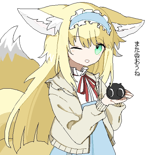 1girl animal_ear_fluff animal_ears arknights black_cat blonde_hair blue_hairband blue_skirt blunt_ends cardigan cat commentary_request cowboy_shot creature crossover fox_ears fox_girl fox_tail frilled_hairband frills green_eyes hairband heixiu high-waist_skirt holding holding_creature inu_to_milk jaggy_lines kitsune kyuubi long_hair long_sleeves lowres luo_xiaohei_zhanji multiple_tails neck_ribbon oekaki official_alternate_costume one_eye_closed open_cardigan open_clothes parted_lips puffy_long_sleeves puffy_sleeves red_ribbon ribbon shirt simple_background skirt suzuran_(arknights) suzuran_(spring_praise)_(arknights) tail white_background white_shirt yellow_cardigan