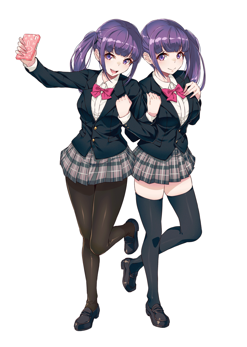 2girls 40hara bad_id bad_twitter_id black_footwear black_pantyhose black_thighhighs cellphone closed_mouth collared_shirt commentary_request futaba_kano futaba_yuno highres holding holding_phone iya_na_kao_sare_nagara_opantsu_misete_moraitai loafers looking_at_viewer multiple_girls open_mouth pantyhose phone pleated_skirt purple_hair school_uniform shirt shoes side_ponytail simple_background skirt smartphone smile thighhighs white_background white_shirt