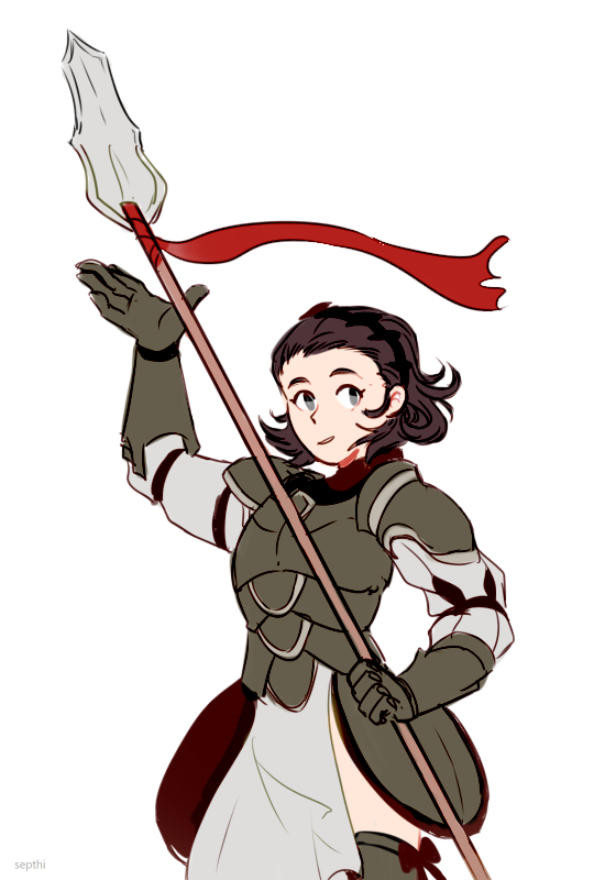 1girl armor brown_hair fire_emblem fire_emblem_fates grey_eyes hair_slicked_back holding holding_polearm holding_weapon lance looking_to_the_side medium_hair nintendo polearm septhi-draw solo sophie_(fire_emblem) upper_body weapon