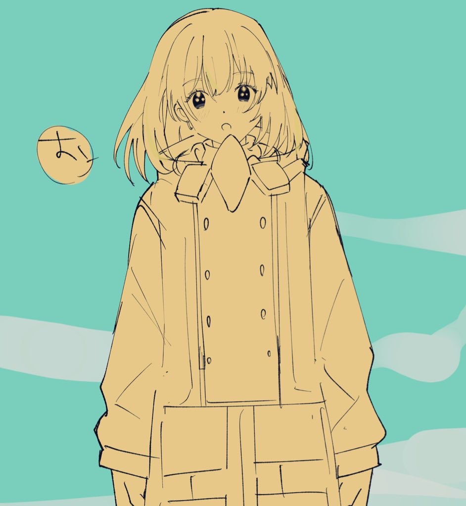 1girl :o arknights blue_background blush hair_between_eyes inu_to_milk jacket long_sleeves looking_at_viewer magallan_(arknights) monochrome open_mouth puffy_long_sleeves puffy_sleeves simple_background sleeves_past_wrists solo translation_request