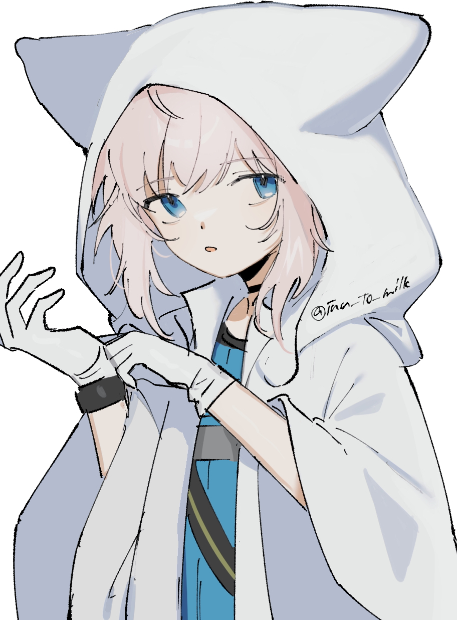 1girl animal_ears animal_hood arknights black_choker blue_eyes blue_shirt choker fake_animal_ears gloves hands_up highres hood hood_up hooded_jacket inu_to_milk jacket long_sleeves looking_at_viewer parted_lips pink_hair shirt simple_background solo sussurro_(arknights) twitter_username upper_body watermark white_background white_gloves white_jacket wide_sleeves