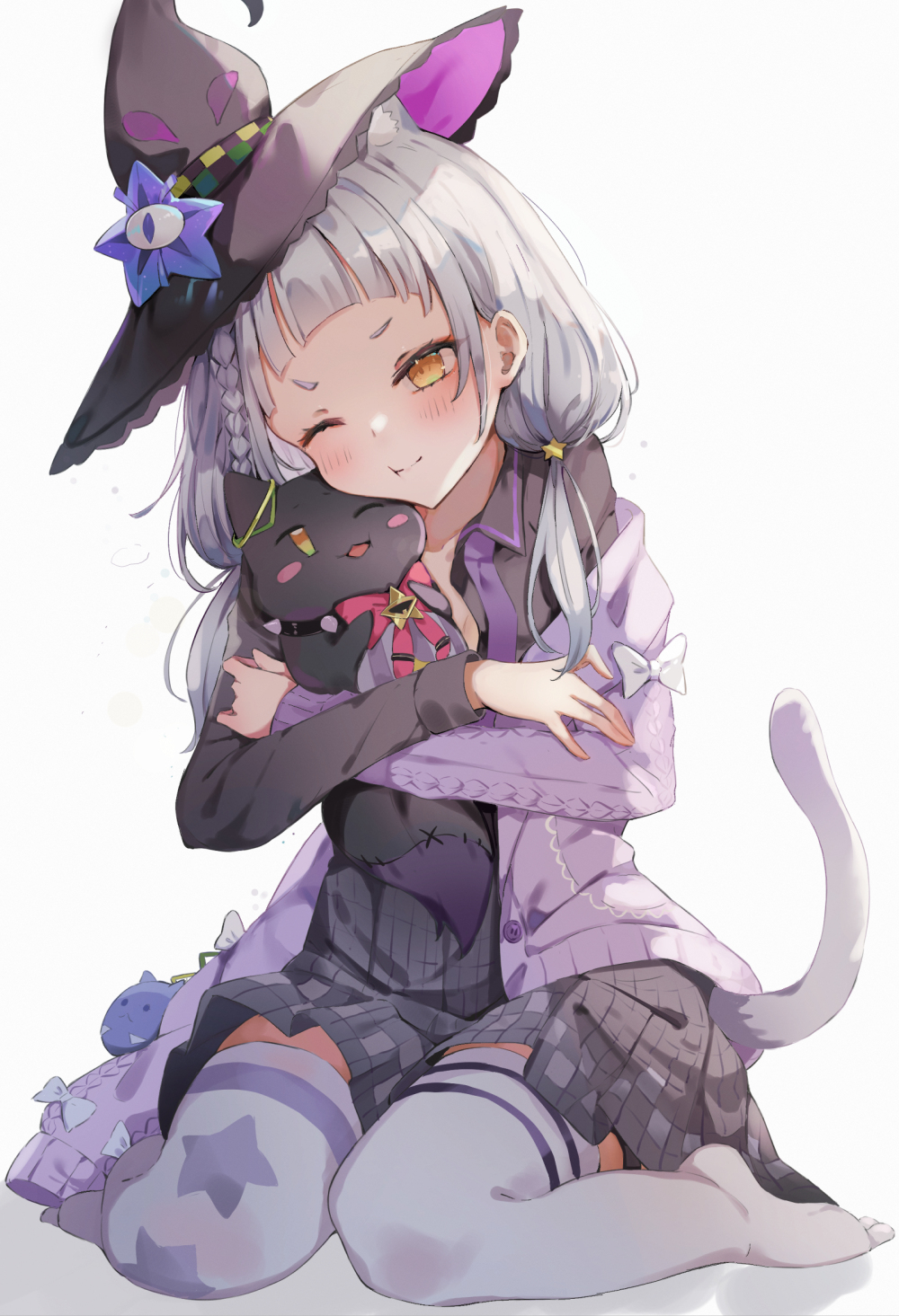 1girl animal_ears black_hat cat cat_ears hat highres hololive miakiuehashi murasaki_shion one_eye_closed simple_background sitting smile solo virtual_youtuber white_hair witch_hat yellow_eyes