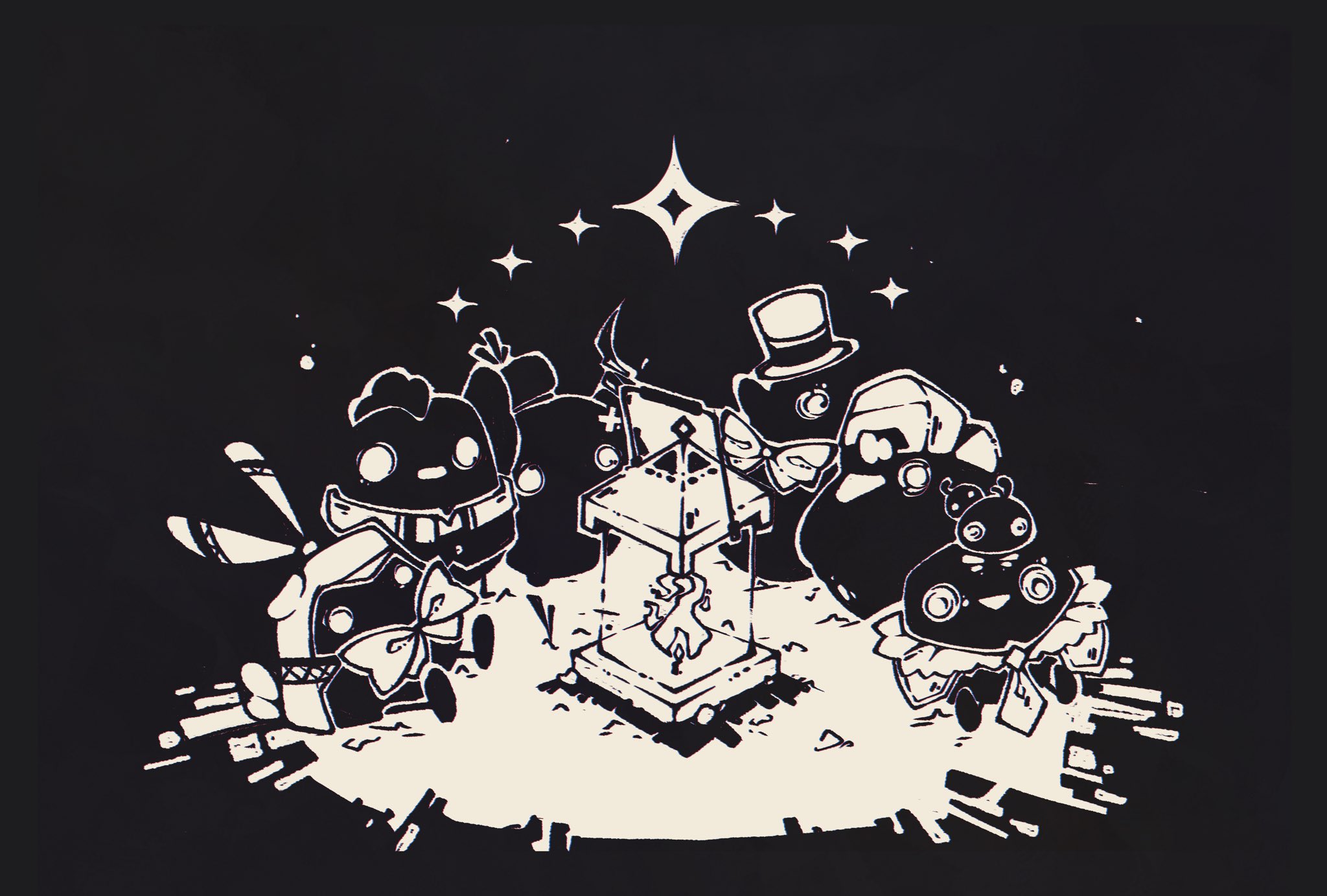 6+others beak bird bow bowtie cloak feathers hat highres holotori hololive hololive_english hololive_indonesia hood hooded_cloak lantern light light_particles monochrome multiple_others mumei_(song)_(hololive) nanashi_mumei nanashi_mumei_(owl) necktie nerissa_ravencroft nerissa_ravencroft_(raven) oozora_subaru pavolia_reine pavolia_reine_(peahen) rosesiames sitting star_(sky) subaru_duck takanashi_kiara takanashi_kiara_(phoenix) takane_lui takane_lui_(hawk) top_hat virtual_youtuber