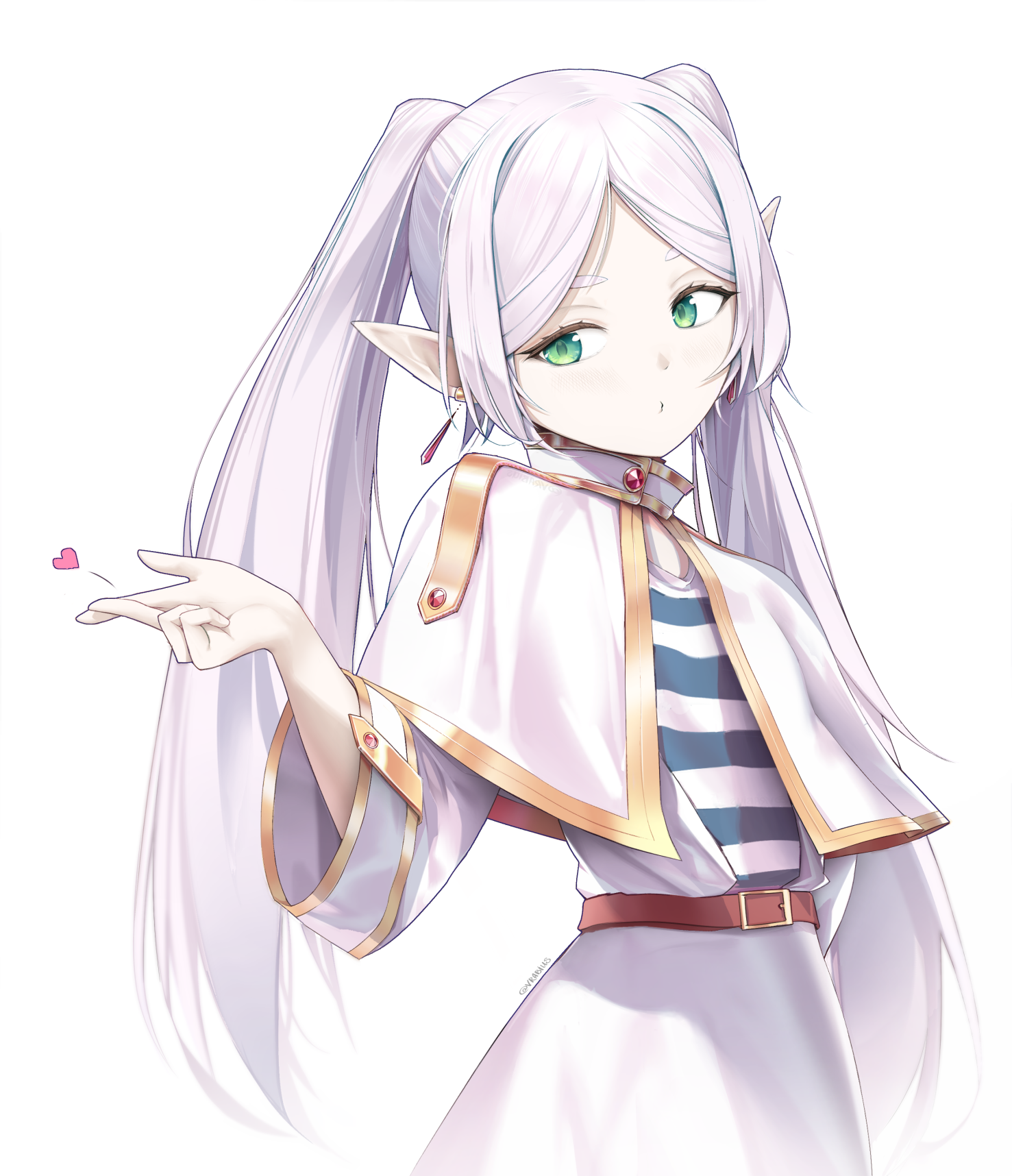 1girl artist_name belt black_shirt brown_belt capelet closed_mouth commentary cowboy_shot earrings elf english_commentary frieren gold_trim green_eyes hand_up heart high_collar highres jacket jewelry long_hair long_sleeves looking_to_the_side parted_bangs pointy_ears shirt simple_background single_earring skirt skirt_set solo sousou_no_frieren standing striped_clothes striped_shirt teardrop_earrings twintails vrabius white_background white_capelet white_hair white_jacket white_shirt white_skirt
