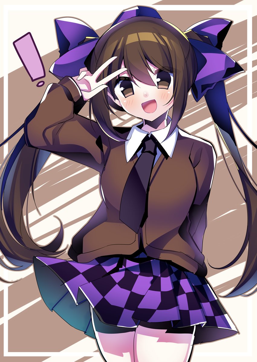 1girl :d black_necktie black_skirt brown_background brown_eyes brown_hair brown_jacket checkered_clothes checkered_skirt collared_shirt cowboy_shot hair_ribbon hat highres himekaidou_hatate jacket kujou_mikuru looking_at_viewer necktie one-hour_drawing_challenge open_mouth purple_hat purple_ribbon purple_skirt ribbon shirt skirt smile solo tokin_hat touhou twintails white_shirt