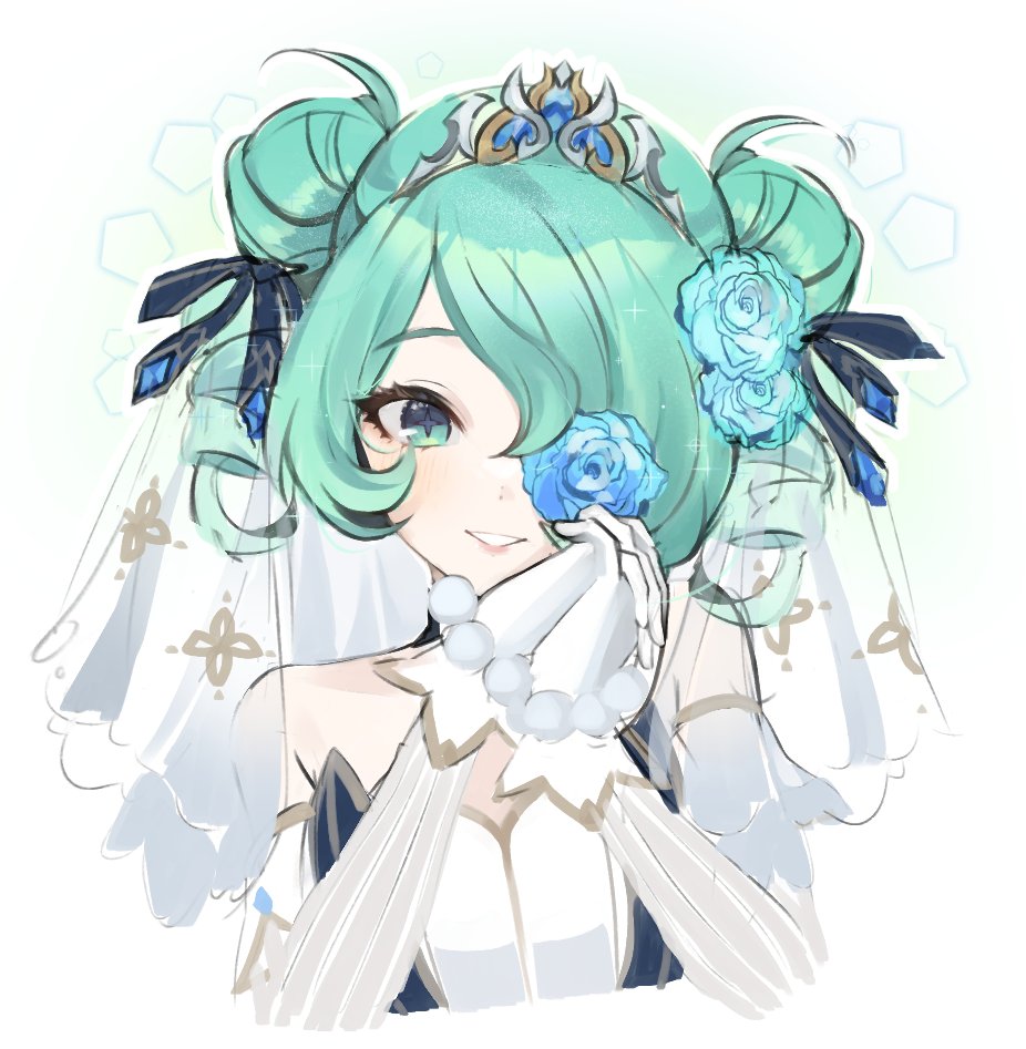 1girl bare_shoulders black_ribbon blue_flower blush bridal_veil bride cropped_torso double_bun dress drill_hair flower flower_over_eye gloves green_eyes green_hair gwen_(league_of_legends) hair_bun hair_ornament hair_ribbon hands_up interlocked_fingers league_of_legends long_sleeves prestige_crystal_rose_gwen ribbon short_hair simple_background smile solo taeseog_(jts_lol) teeth twin_drills veil wedding_dress white_background white_gloves