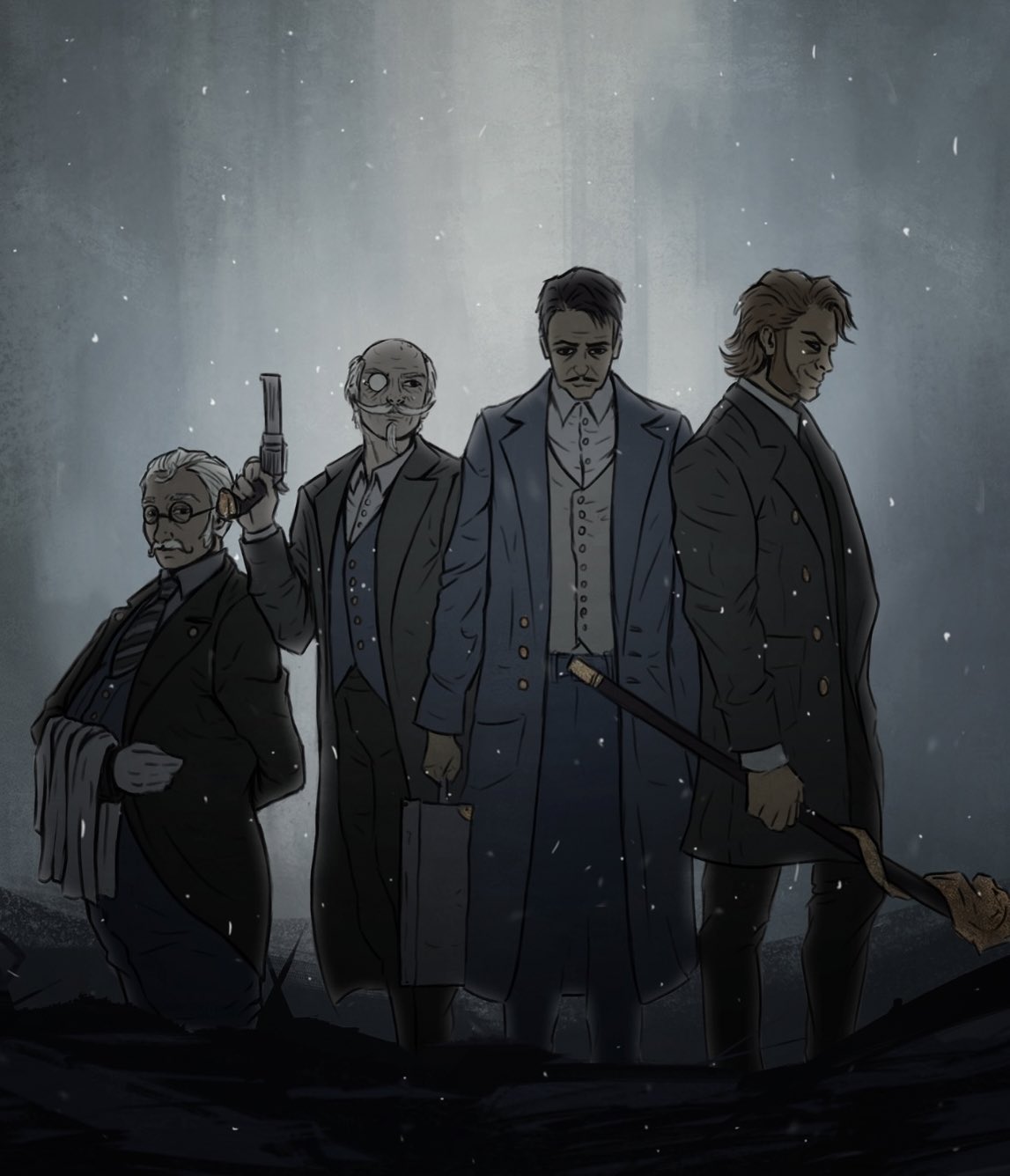 4boys beard black_hair black_pants blonde_hair blue_coat blue_pants cane closed_mouth coat commentary dress_shirt earl_d_wilson facial_hair feet_out_of_frame francois_guillaume_de_tesseraque from_side german_commentary glasses graf_mon grey_background grey_coat gun hand_up handgun highres holding holding_cane holding_gun holding_suitcase holding_towel holding_weapon inked_bad_wolf jacket looking_at_viewer lord_henry_grey male_focus monocle morriton_manor multiple_boys mustache open_clothes open_jacket pants profile round_eyewear shirt short_hair snowing suitcase towel towel_on_arm vest weapon white_shirt