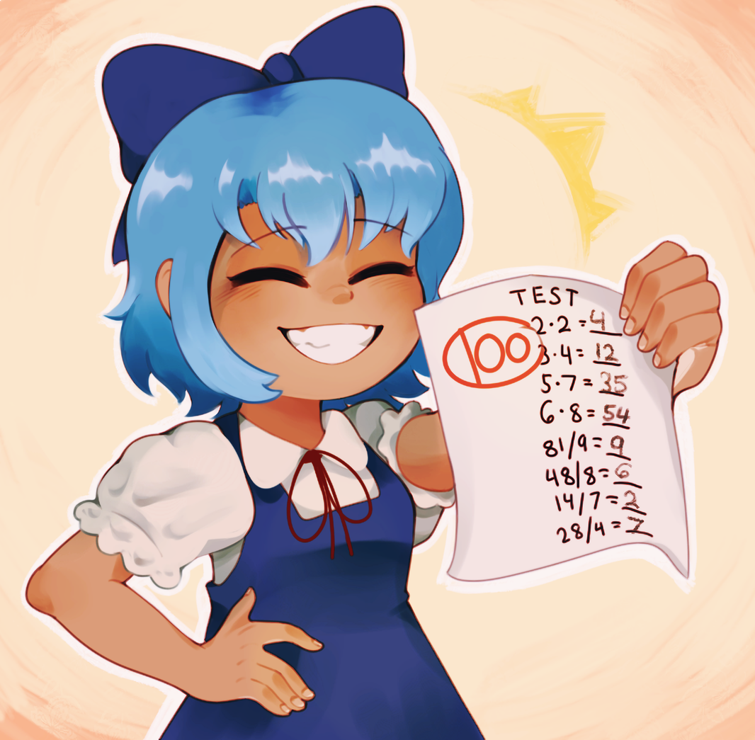 1girl blue_bow blue_dress blue_hair bow breasts cirno clem_(calmeremerald) closed_eyes collared_shirt commentary cowboy_shot dark-skinned_female dark_skin dress english_commentary english_text academic_test facing_viewer frilled_sleeves frills hair_bow hand_on_own_hip happy holding holding_paper medium_hair neck_ribbon missing_wings open_mouth paper pinafore_dress puffy_short_sleeves puffy_sleeves red_ribbon ribbon shirt short_sleeves simple_background sleeveless sleeveless_dress small_breasts smile solo teeth academic_test touhou white_shirt yellow_background