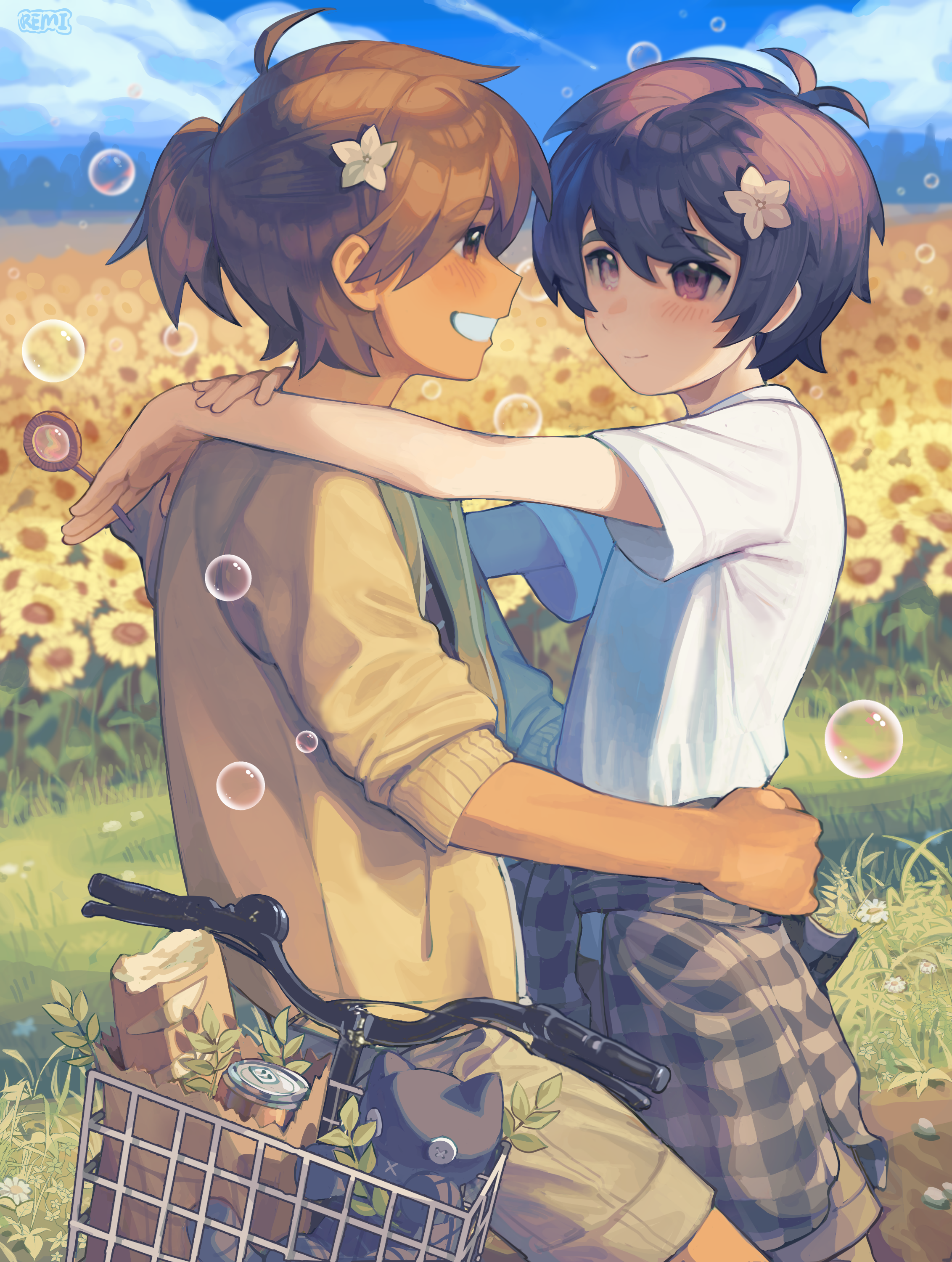 2boys absurdres alternate_hairstyle bicycle bicycle_basket black_hair brown_eyes brown_hair bubble bubble_wand dark-skinned_male dark_skin flower hair_flower hair_ornament highres hug kel_(faraway)_(omori) kel_(omori) looking_at_another multiple_boys omori outdoors ponytail purple_eyes remi_(mozzaremi) shirt short_hair short_ponytail short_sleeves sunflower sunny_(omori) white_shirt
