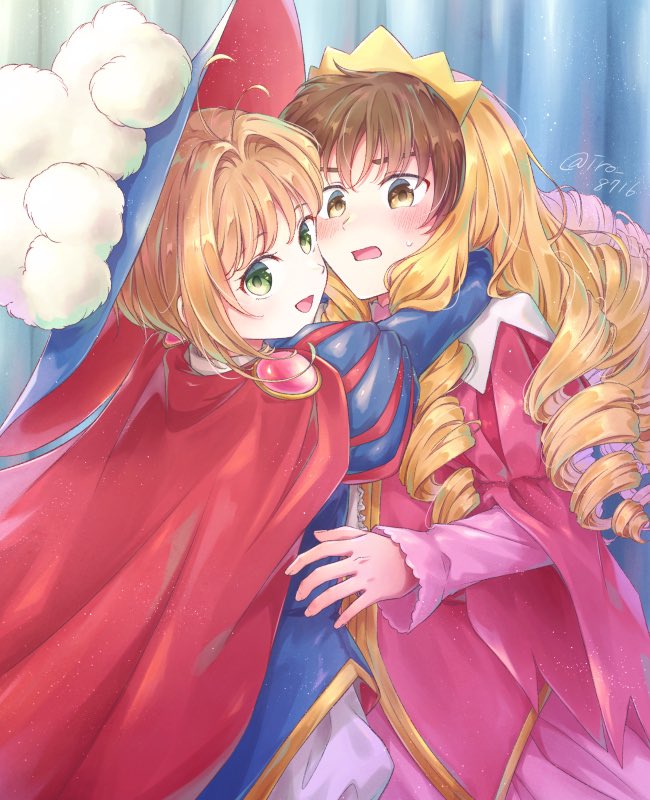 1boy 1girl blue_headwear blush brown_hair cape cardcaptor_sakura child couple dress green_eyes happy hug kinomoto_sakura kinomoto_sakura_(sakura_prince) li_syaoran official_alternate_costume open_mouth pink_dress red_cape tsukisaka_iro twitter_username