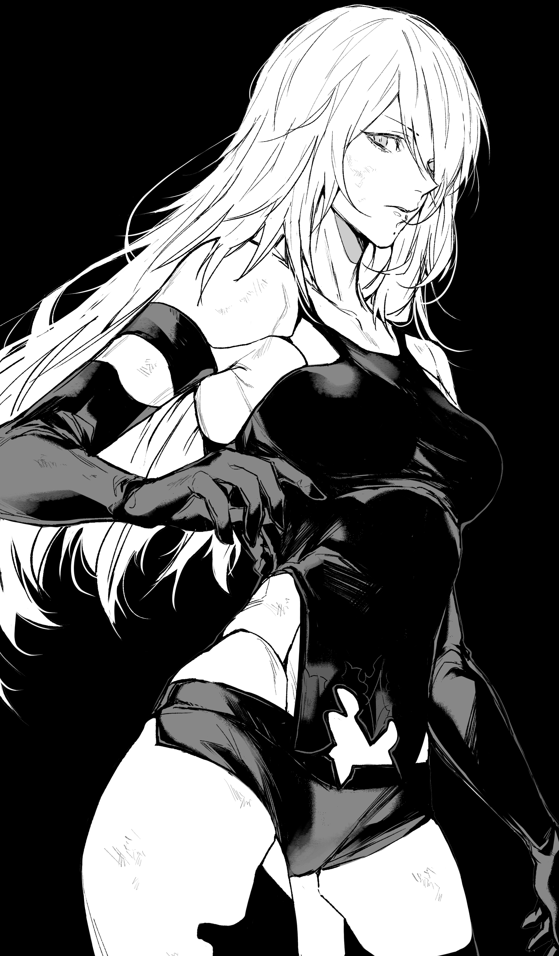 1girl a2_(nier:automata) absurdres android bare_shoulders black_dress black_gloves breasts dress elbow_gloves gloves greyscale highres joints long_hair looking_at_viewer medium_breasts mole mole_under_mouth monochrome nier:automata nier_(series) nishiii26miii robot_joints shorts solo tank_top thighhighs white_hair
