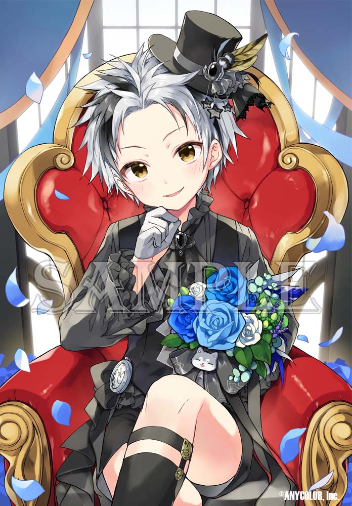 1boy black_gem black_hair black_hat black_shorts blue_flower blue_rose brown_eyes crossed_legs flower gem gloves grey_hair half_gloves hat kamiyoshi_rika male_focus multicolored_hair nijisanji official_art on_throne rose sample_watermark shorts sitting solo streaked_hair suzuki_masaru suzuki_masaru_(stagewear) throne top_hat virtual_youtuber watermark white_gloves