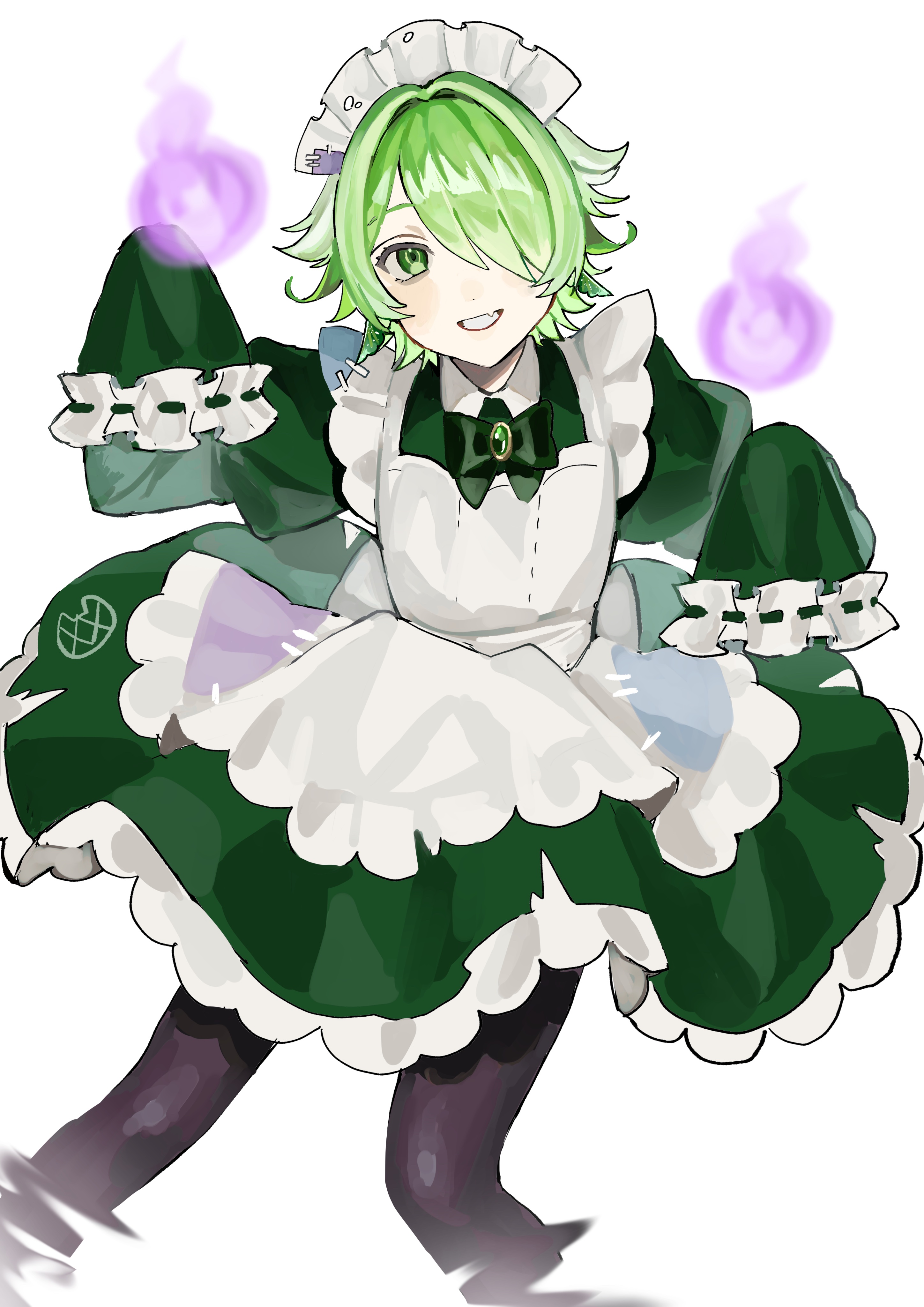 1girl absurdres apron black_pantyhose dress fang gem green_dress green_eyes green_gem green_hair hair_over_one_eye highres indie_virtual_youtuber kanakan1218 long_sleeves maid_headdress pantyhose sasara_mei short_hair sleeves_past_fingers sleeves_past_wrists smile solo virtual_youtuber white_apron