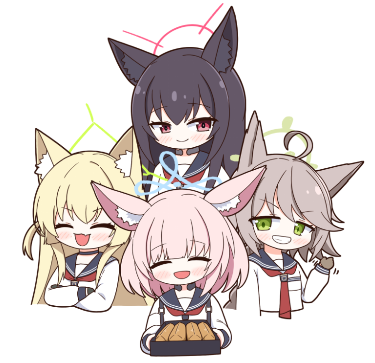 4girls achilles_(yosshyachillesd) animal_ears black_choker black_hair black_sailor_collar blonde_hair blue_archive blue_halo blush brown_hair choker closed_eyes closed_mouth fox_ears fox_platoon_(blue_archive) green_eyes green_halo halo kurumi_(blue_archive) long_hair long_sleeves multiple_girls neckerchief niko_(blue_archive) open_mouth otogi_(blue_archive) pink_hair red_eyes red_halo red_neckerchief sailor_collar school_uniform serafuku short_hair simple_background smile white_background yukino_(blue_archive)