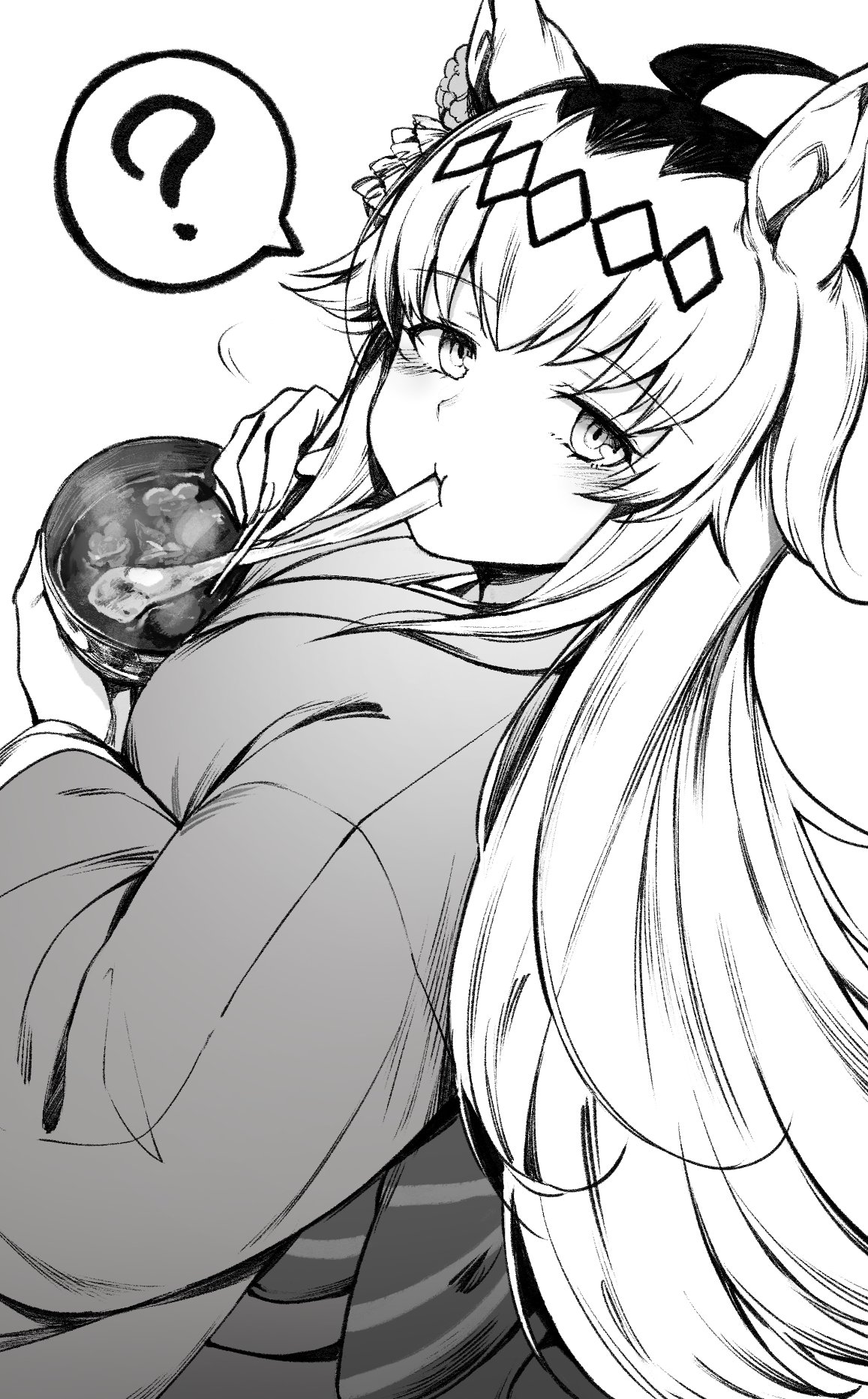 1girl ? ahoge animal_ears blush bowl breasts chopsticks closed_mouth eating food greyscale hair_ornament highres holding holding_bowl holding_chopsticks horse_ears japanese_clothes kimono long_hair long_sleeves looking_at_viewer looking_up mochi monochrome motion_lines new_year nihudau obi oguri_cap_(umamusume) sash small_breasts solo spoken_question_mark umamusume upper_body zouni_soup