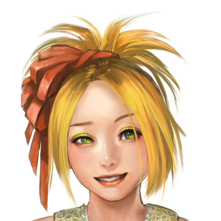 1girl asahi_horiuchi blonde_hair final_fantasy final_fantasy_x green_eyes hair_ornament hair_ribbon lipstick looking_at_viewer makeup ribbon rikku_(ff10) short_hair simple_background smile solo transparent_background