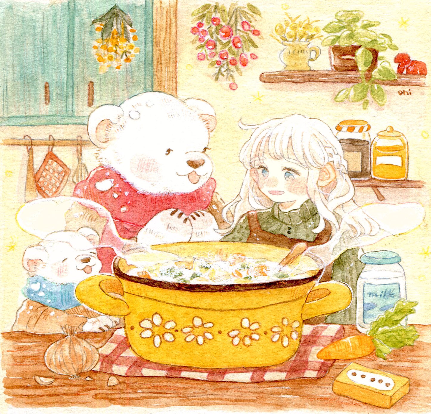 1girl arched_bangs bear blue_eyes blush carrot food highres indoors long_hair oniheya_53 open_mouth original painting_(medium) plant potted_plant traditional_media watercolor_(medium) wavy_hair white_hair window