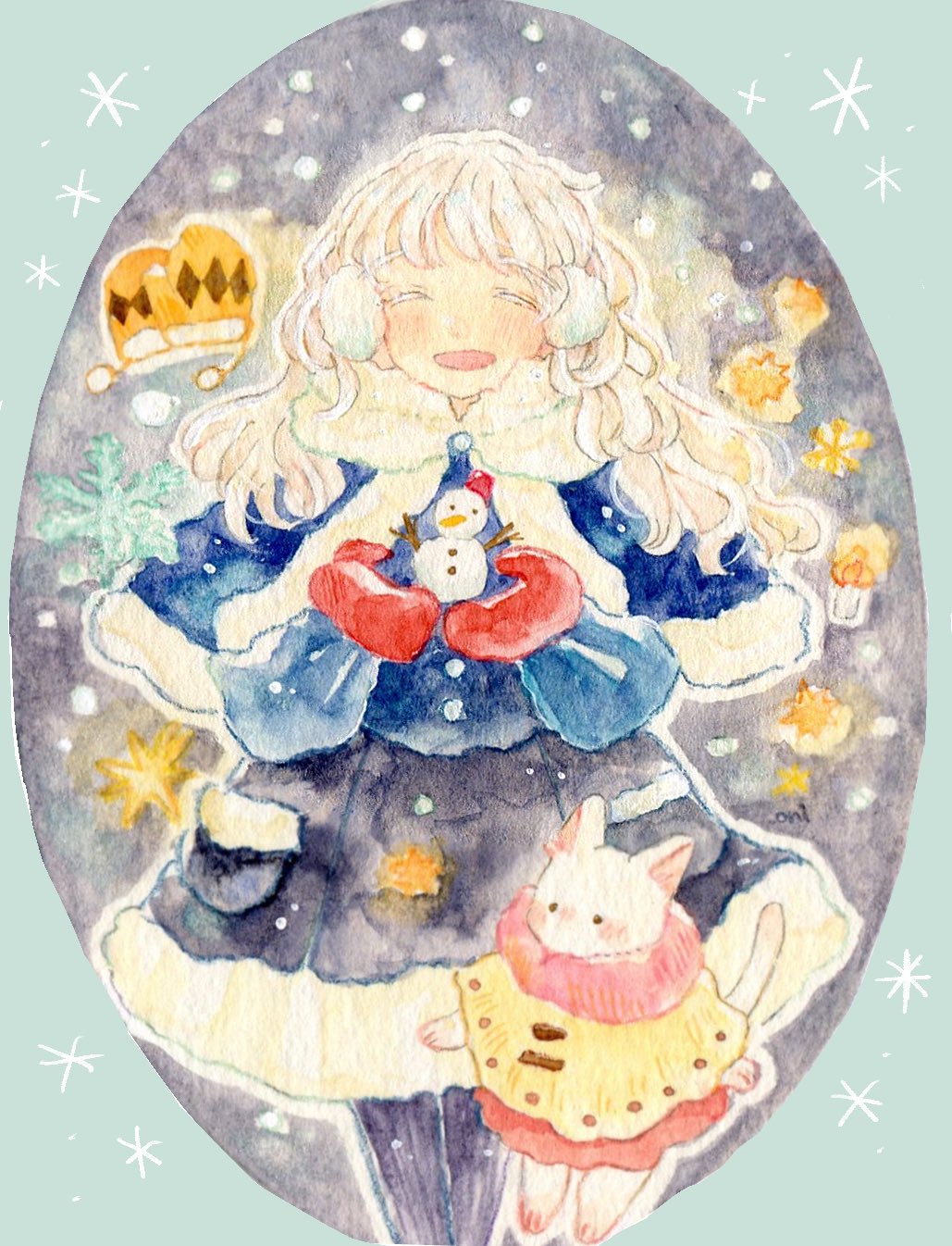 1girl animal black_skirt cat closed_eyes earmuffs gloves highres holding long_hair long_sleeves mittens oniheya_53 open_mouth original painting_(medium) signature skirt traditional_media watercolor_(medium) wavy_hair white_cat white_hair