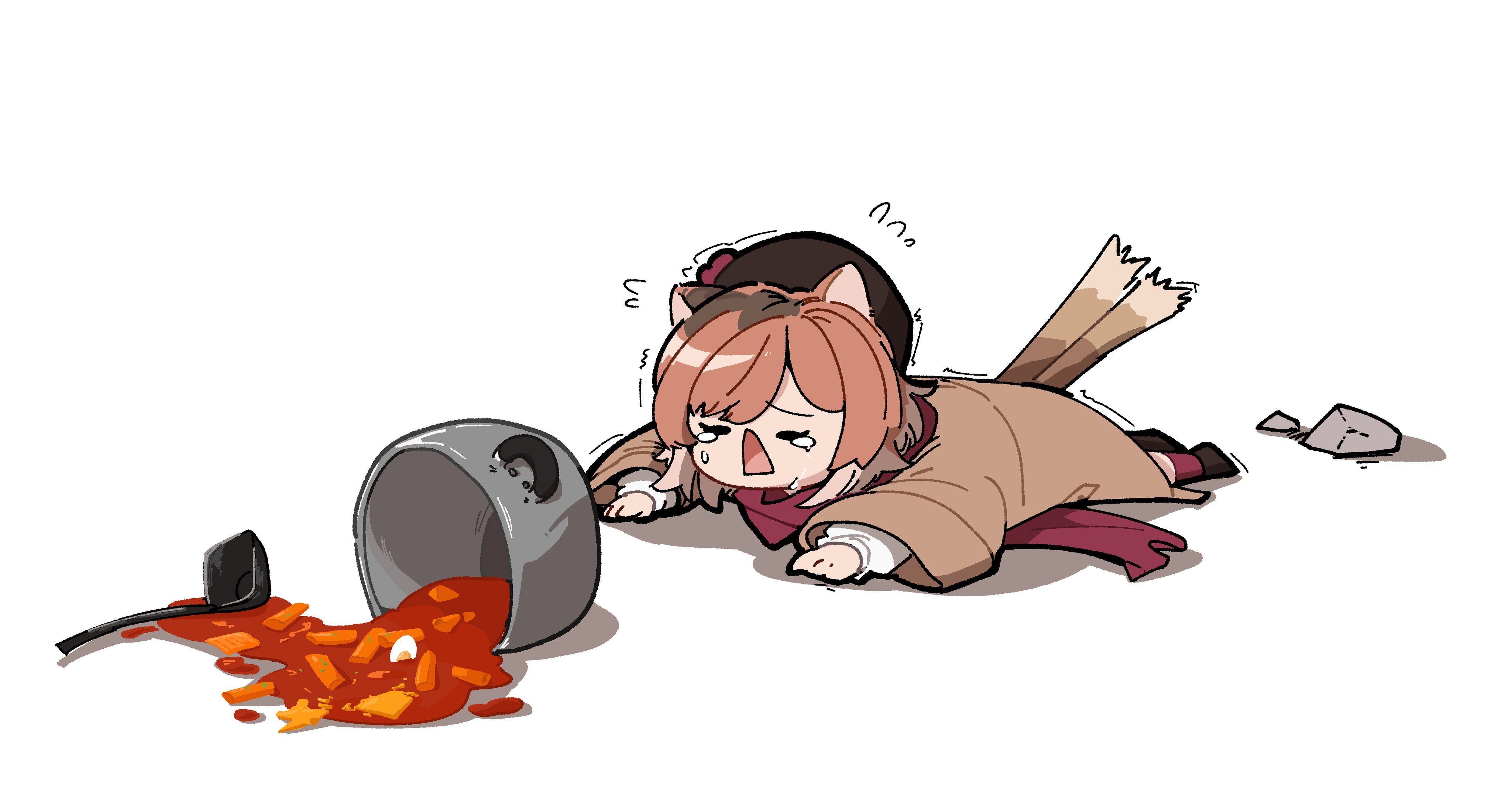 1girl absurdres animal_ears arknights brown_coat cat_ears cat_tail closed_eyes coat commentary_request cooking_pot crying failure fallen_down food hat highres ingsae ladle long_sleeves motion_lines mousse_(arknights) mousse_(campfire_cooking_smoke)_(arknights) multicolored_hair official_alternate_costume open_mouth red_scarf red_socks rock scarf shadow short_hair simple_background socks soup tail two-tone_hair white_background