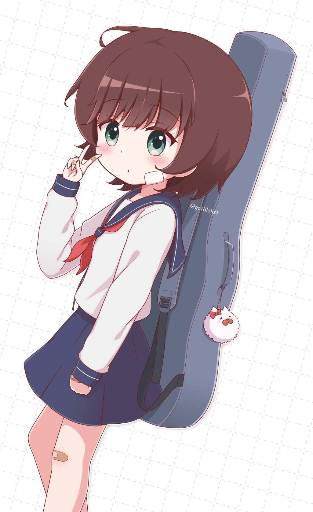 1girl bandaid bandaid_on_hand bandaid_on_knee bandaid_on_leg bemani blue_sailor_collar blue_skirt blush brown_hair closed_mouth commentary_request dotted_line feet_out_of_frame goth_risuto green_eyes highres instrument_case kino_anzu long_sleeves looking_at_viewer neckerchief pleated_skirt puffy_long_sleeves puffy_sleeves red_neckerchief sailor_collar school_uniform serafuku shirt skirt sleeves_past_wrists solo sound_voltex standing twitter_username white_background white_shirt