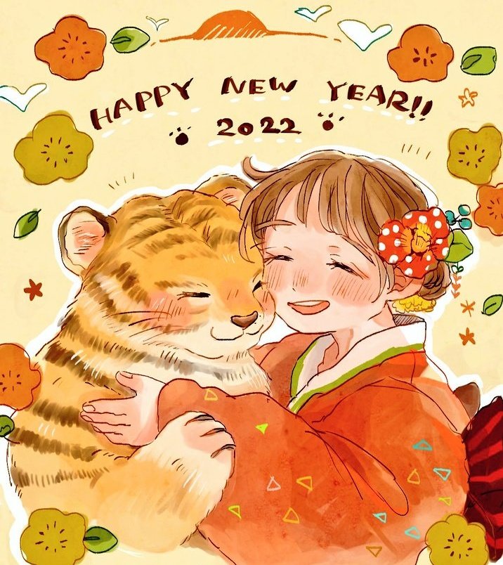 1girl closed_eyes english_text happy_new_year new_year oniheya_53 open_mouth original painting_(medium) short_hair smile solo teeth tiger traditional_media upper_body upper_teeth_only watercolor_(medium) yellow_background