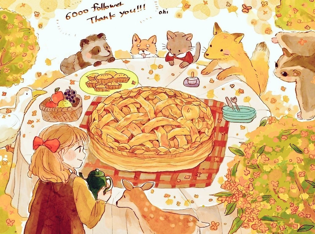 1girl animal animal_ears artist_name bird brown_hair cat closed_mouth clothed_animal deer duck food fox holding long_hair oniheya_53 original outdoors oversized_food oversized_object painting_(medium) pie ponytail smile squirrel table traditional_media watercolor_(medium)
