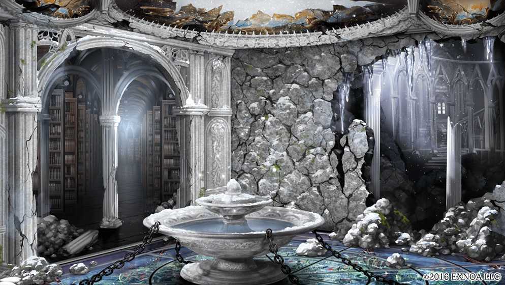 arch bookshelf broken_pillar broken_wall bungou_to_alchemist chain copyright_notice crack dome fountain icicle indoors library no_humans official_art pillar rubble ruins scenery snow snowing stairs