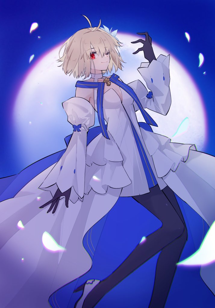 1girl ahoge archetype_earth arcueid_brunestud arcueid_brunestud_(mooncancer) black_gloves black_pantyhose blonde_hair blue_ribbon detached_sleeves dress full_moon gloves hand_up moon nayu_tundora night one_eye_closed pantyhose petals red_eyes ribbon short_hair sky solo tsukihime tsukihime_(remake) white_dress