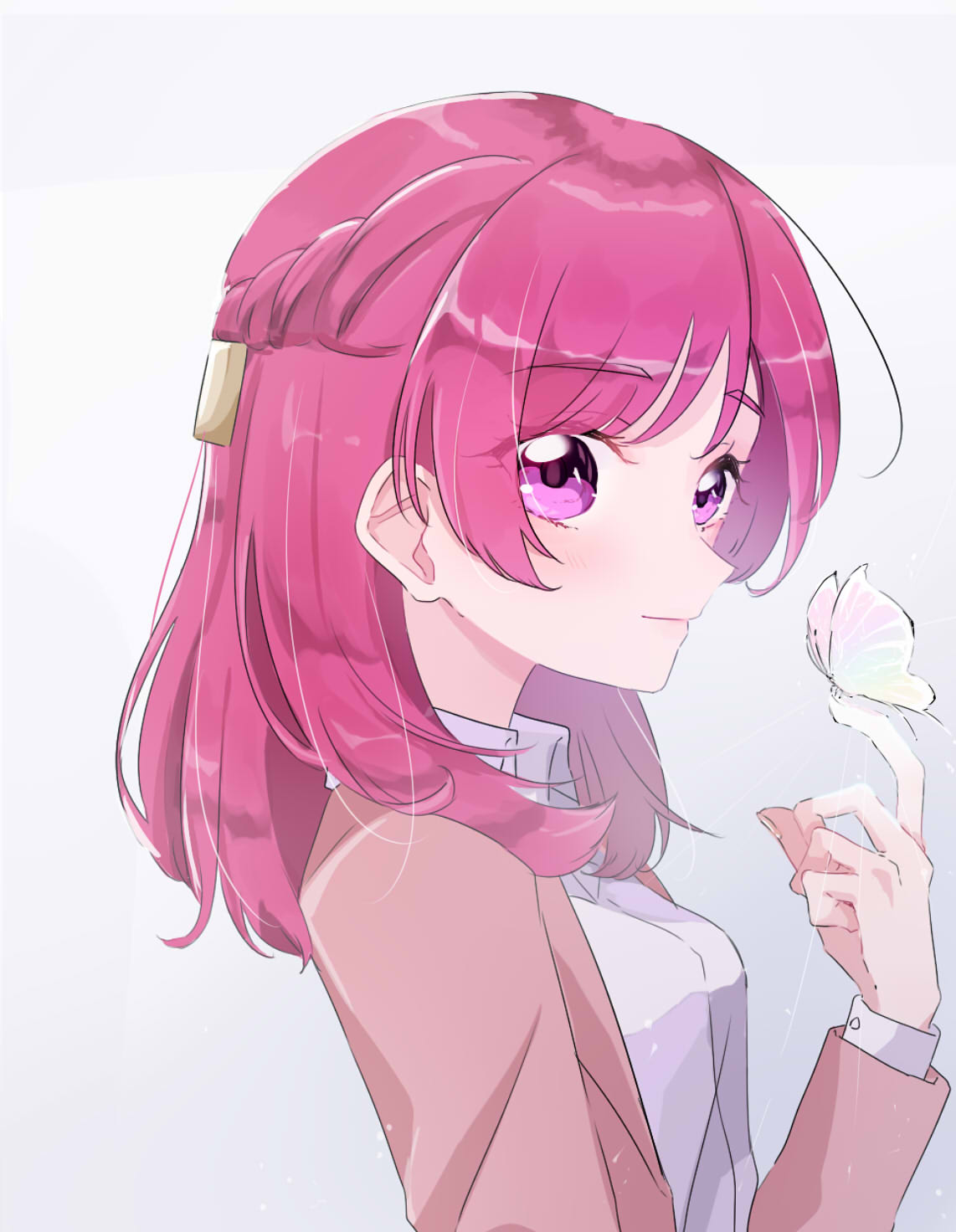 1girl braid bug butterfly emi537469 french_braid from_side hair_ornament highres insect jacket kibou_no_chikara_otona_precure_'23 looking_at_viewer medium_hair pink_eyes pink_hair pink_jacket precure suit_jacket upper_body yumehara_nozomi
