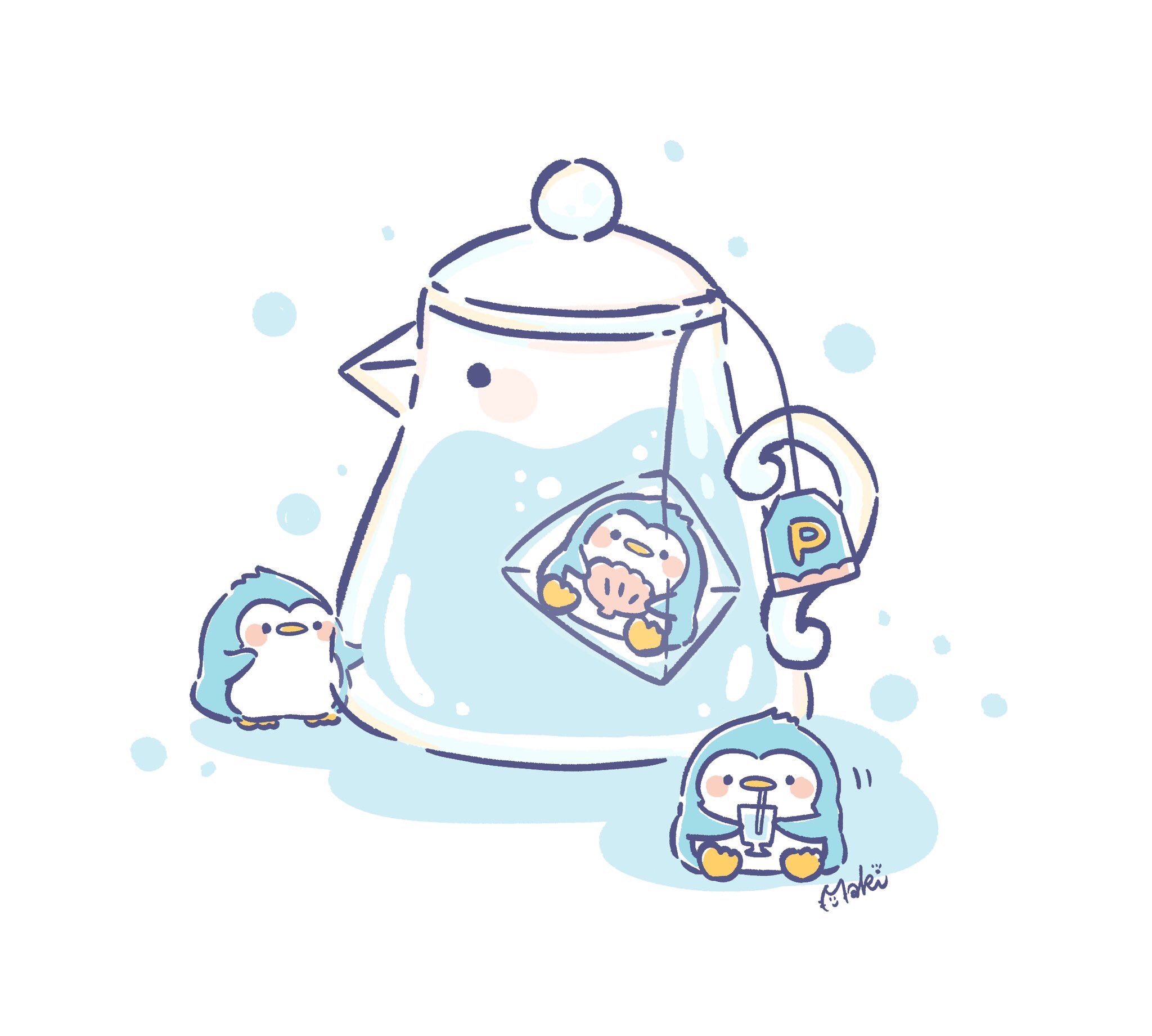 animal_focus artist_name bag beak bird black_eyes blush_stickers bubble chara_chara_makiato commentary_request cup drinking drinking_straw glass highres holding holding_cup holding_shell in_bag in_container in_teapot motion_lines no_humans original oversized_object penguin shell signature sitting solid_circle_eyes submerged teabag white_background