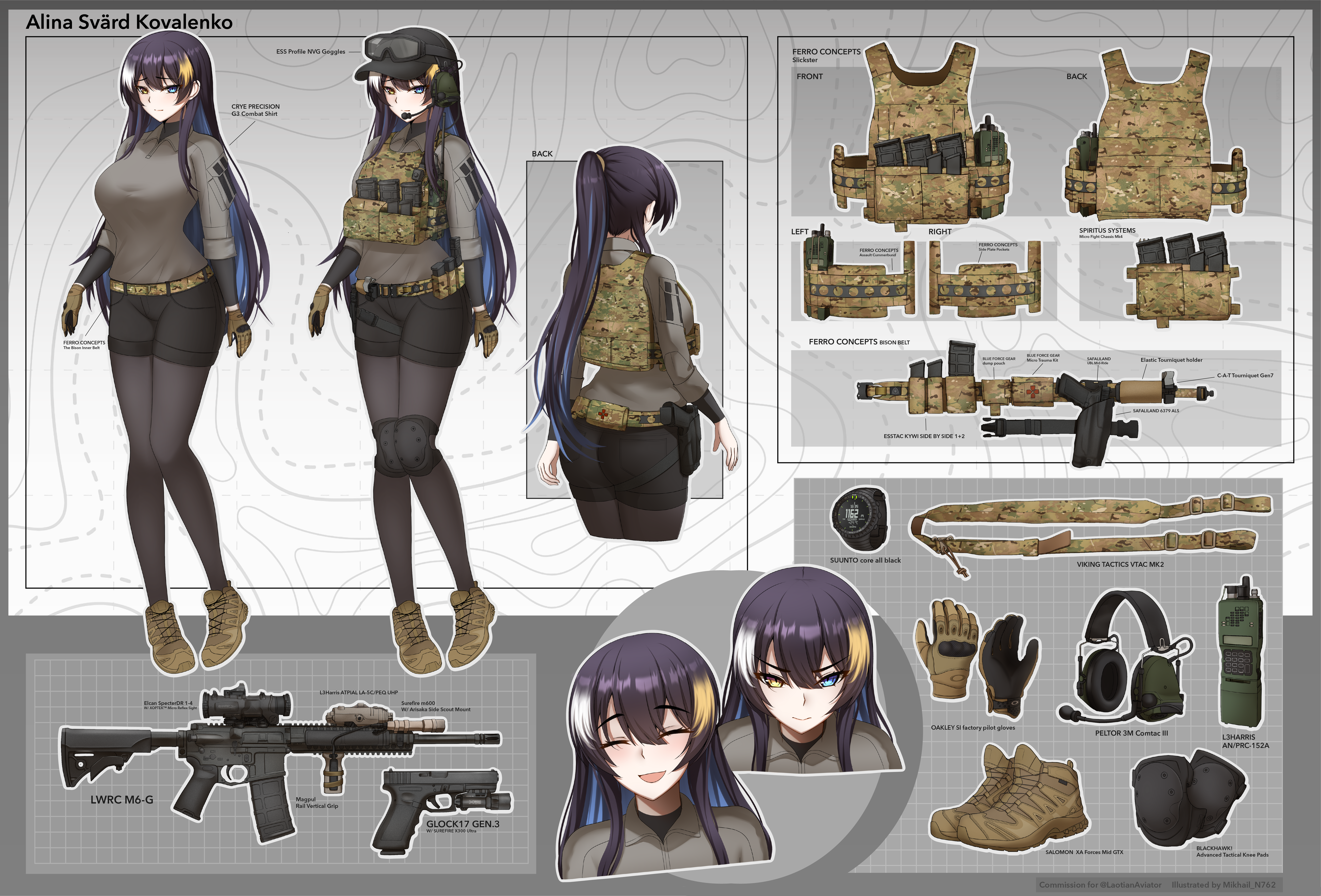 absurdres alina_svard_kovalenko_(laotianaviator) black_shorts equipment_layout glock gloves gun handgun harness heterochromia highres mikhail_n762 multicolored_hair original pantyhose reference_sheet shorts tactical_clothes two-tone_gloves weapon