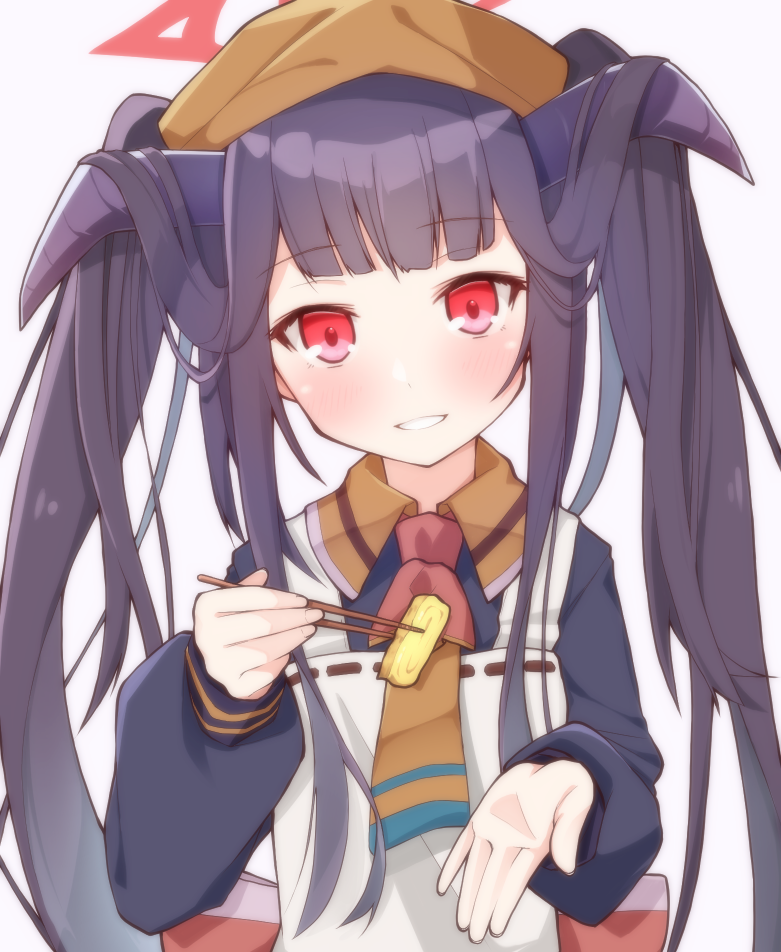 1girl apron black_hair black_horns black_shirt blue_archive chopsticks collared_shirt commentary_request demon_horns food fuuka_(blue_archive) halo hand_up headscarf holding holding_chopsticks horns long_hair long_sleeves looking_at_viewer puffy_long_sleeves puffy_sleeves rateratte red_eyes red_halo ribbon-trimmed_apron ribbon_trim shirt simple_background smile solo twintails upper_body very_long_hair white_apron white_background yellow_headscarf