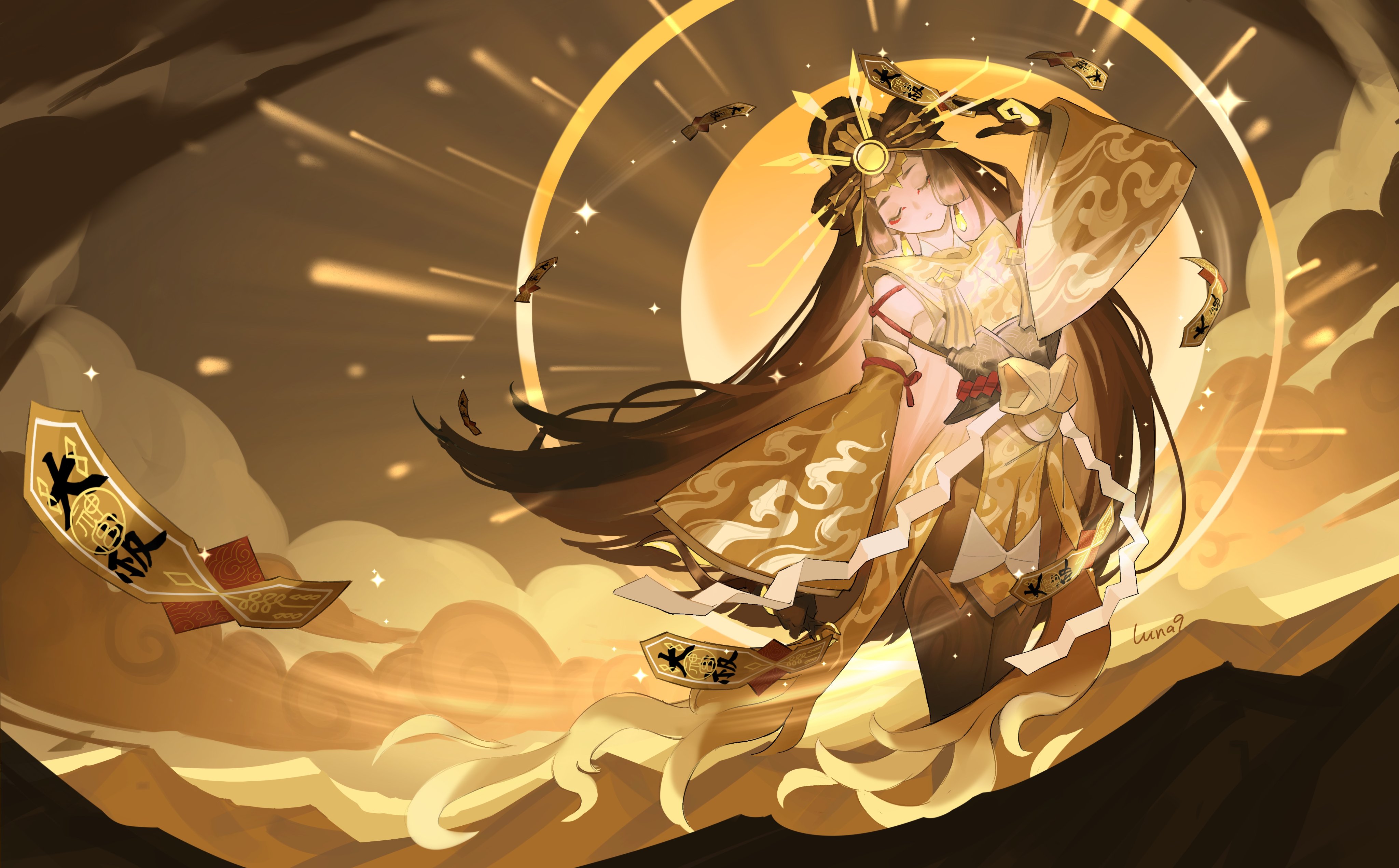 absurdres amaterasu_(mythology) amaterasu_kiriko bad_link bad_twitter_link closed_eyes cloud dress earrings eyeliner gloves headdress highres japanese_clothes jewelry kiriko_(overwatch) kunai luna-9 makeup ofuda overwatch overwatch_2 red_eyeliner sun sunlight weapon yellow_dress