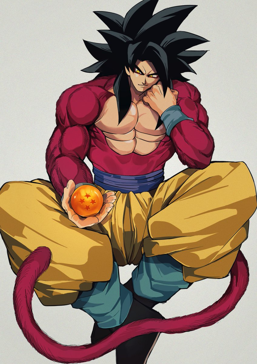 1boy biceps black_hair blue_sash body_fur dragon_ball dragon_ball_(object) dragon_ball_gt gigatan_d long_hair male_focus monkey_boy monkey_tail muscular muscular_male no_nipples pants pectorals red_fur saiyan sash solo son_goku spiked_hair super_saiyan super_saiyan_4 tail yellow_pants