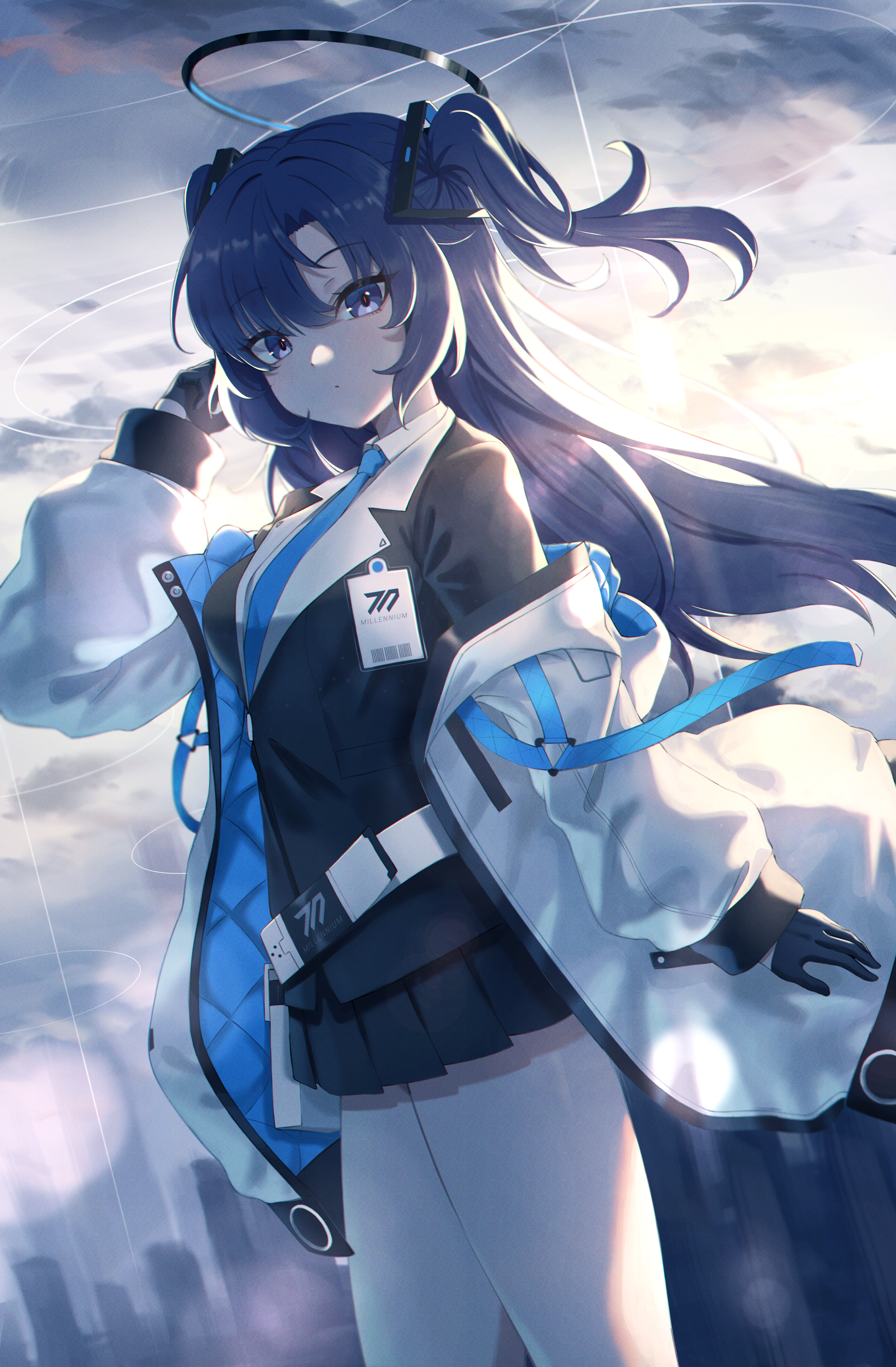 1girl absurdres akazaki_yukino black_gloves black_skirt blue_archive blue_necktie breasts closed_mouth collared_shirt cowboy_shot formal_clothes gloves halo highres id_card jacket long_hair long_sleeves looking_at_viewer mechanical_halo medium_breasts necktie pleated_skirt purple_eyes purple_hair shirt skirt solo suit two-sided_fabric two-sided_jacket two_side_up white_jacket white_shirt yuuka_(blue_archive)