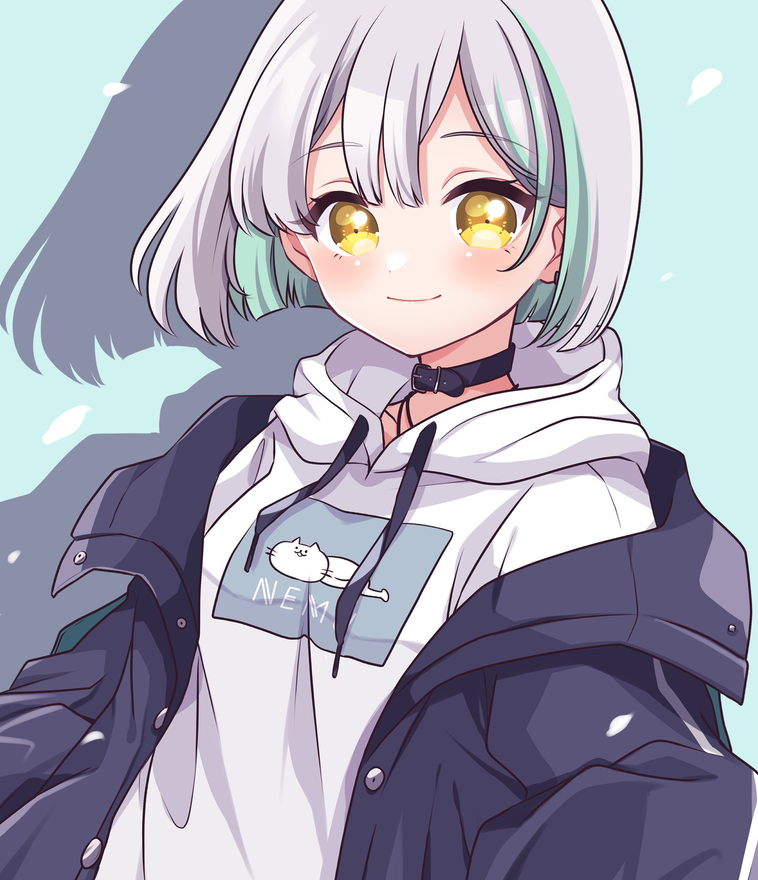 1girl absurdres black_jacket blue_background blue_hair blush breasts closed_mouth commentary_request drop_shadow grey_hair highres hood hood_down hoodie jacket kanade_kanon kanade_kanon_(4th_costume) kino_haruc long_sleeves looking_at_viewer nanashi_inc. open_clothes open_jacket short_hair small_breasts smile solo upper_body virtual_youtuber white_hoodie yellow_eyes