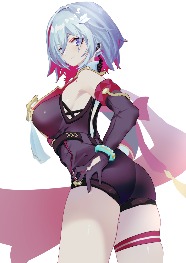 1girl arin_(1010_ssu) ass bare_shoulders blue_eyes blush breasts detached_sleeves elbow_gloves from_behind gloves honkai:_star_rail honkai_(series) large_breasts leotard looking_at_viewer short_hair sideboob smile solo thick_thighs thigh_strap thighs topaz_(honkai:_star_rail) white_hair