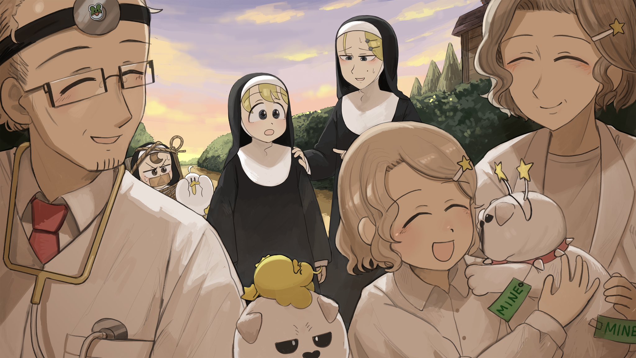 1boy 5girls :d baby_animal bird blonde_hair blue_eyes bound brown_hair bulldog chicken clumsy_nun_(diva) commentary diva_(hyxpk) dog duck duckling english_commentary father_and_child father_and_daughter froggy_nun_(diva) gag habit hair_ornament highres improvised_gag light_brown_hair little_nuns_(diva) little_star_girl_(diva) mother_and_child mother_and_daughter multiple_girls necktie nun nun_headdress open_mouth parent_and_child red_necktie shirt slice_of_life smile star_(symbol) star_hair_ornament stethoscope strict_nun_(diva) tape tape_gag tied_up_(nonsexual) traditional_nun white_shirt