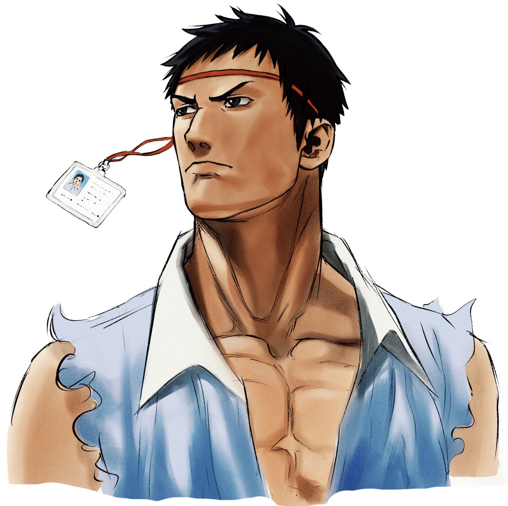 1boy black_hair blue_shirt collarbone cosplay frown highres id_card lanyard looking_to_the_side male_focus nijisanji pectorals ryu_(street_fighter) ryu_(street_fighter)_(cosplay) shirt short_hair simple_background sleeveless solo tengu_nimuru torn_clothes torn_sleeves upper_body virtual_youtuber white_background yashiro_kizuku yashiro_kizuku_(1st_costume)