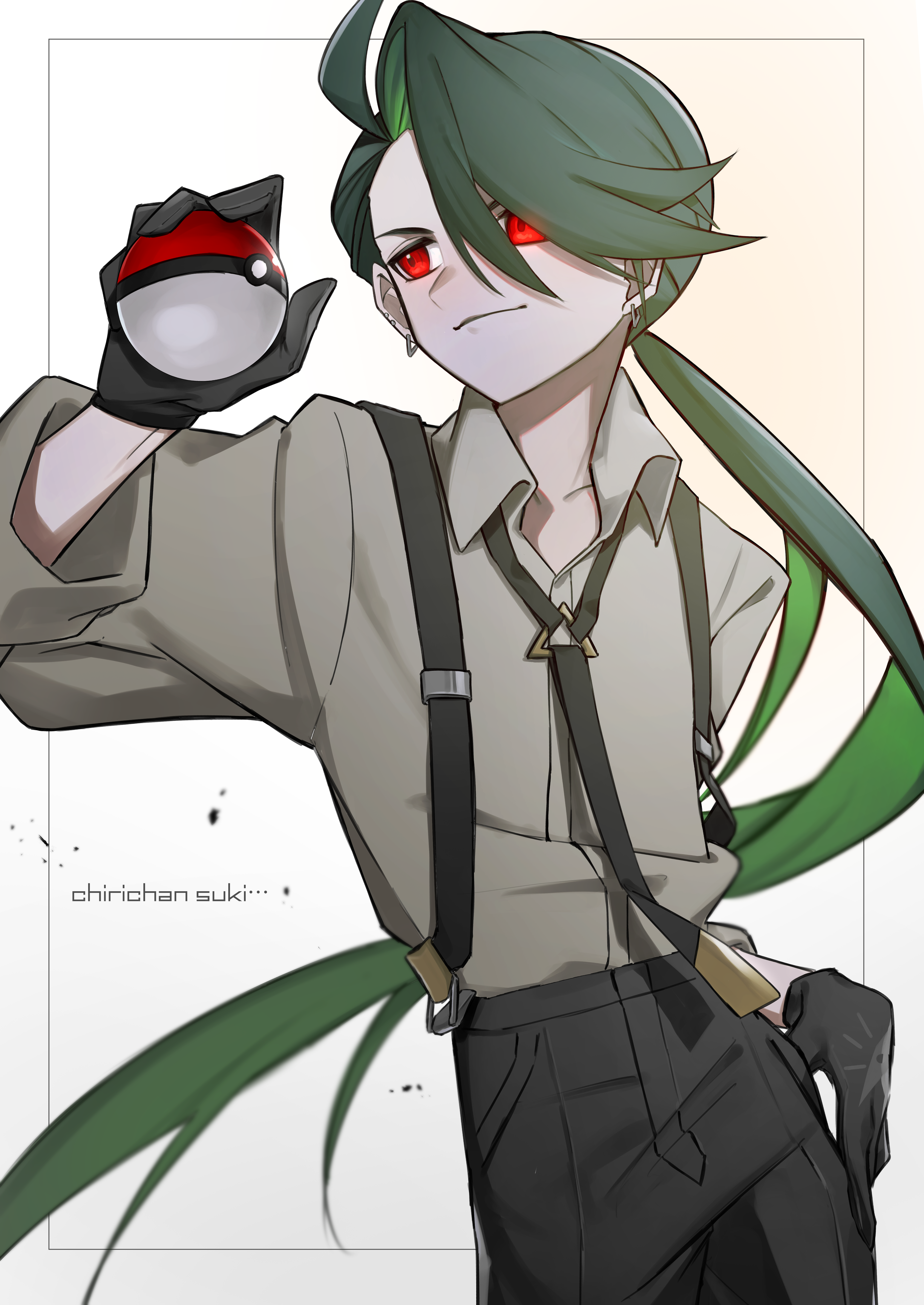 1girl absurdres black_gloves collarbone collared_shirt flat_chest gloves green_hair highres holding holding_poke_ball kodzukinagara long_sleeves low_ponytail nintendo poke_ball pokemon pokemon_sv ponytail red_eyes rika_(pokemon) shirt