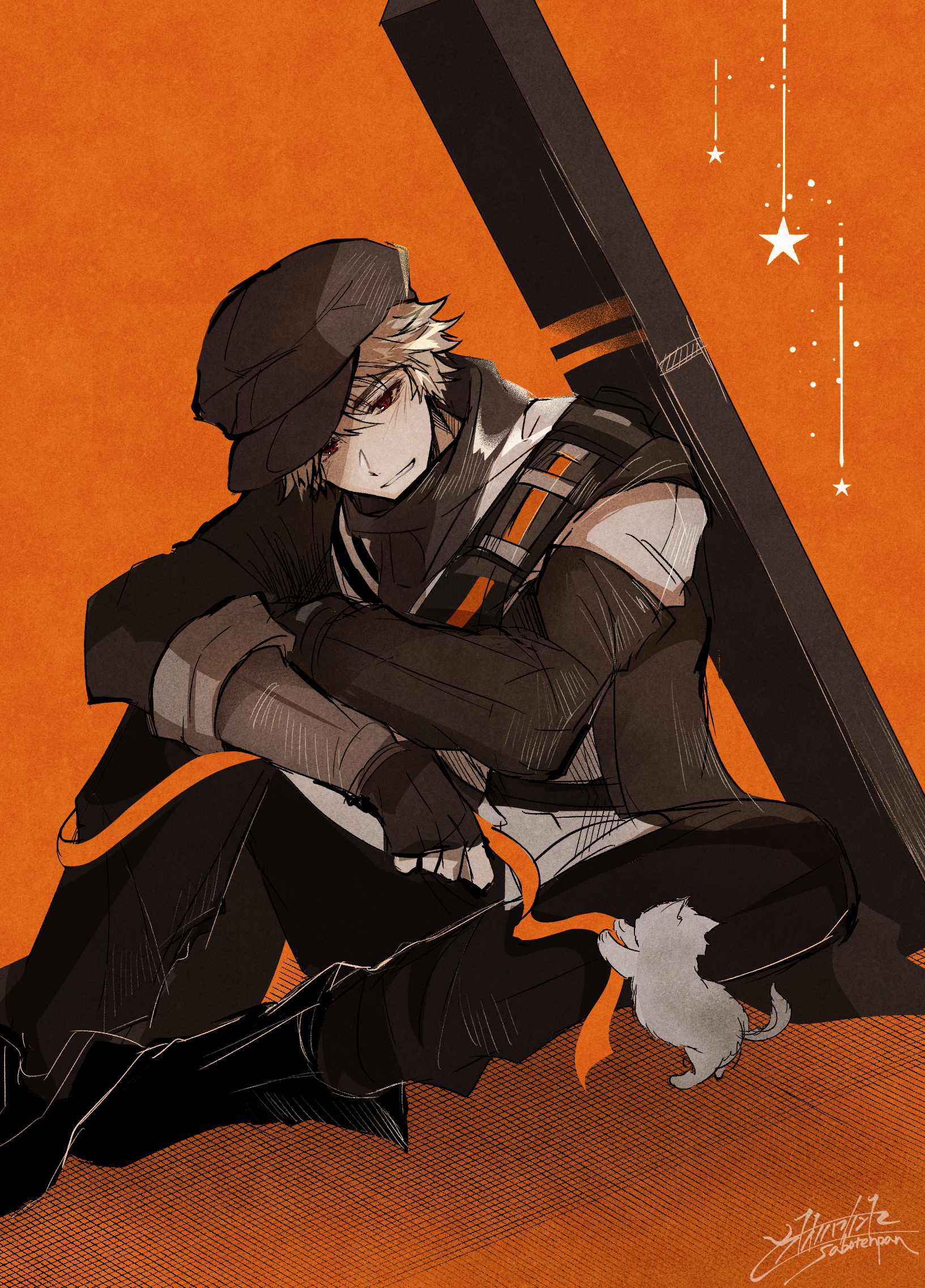 1boy animal arknights baby_animal black_boots black_gloves black_hat black_jacket black_pants boots brown_hair cat fingerless_gloves gloves hair_between_eyes hat highres jacket kitten knee_up long_sleeves male_focus newsboy_cap oonohara_kenya orange_background pants red_(npc)_(arknights) red_eyes signature sitting smile solo star_(symbol)