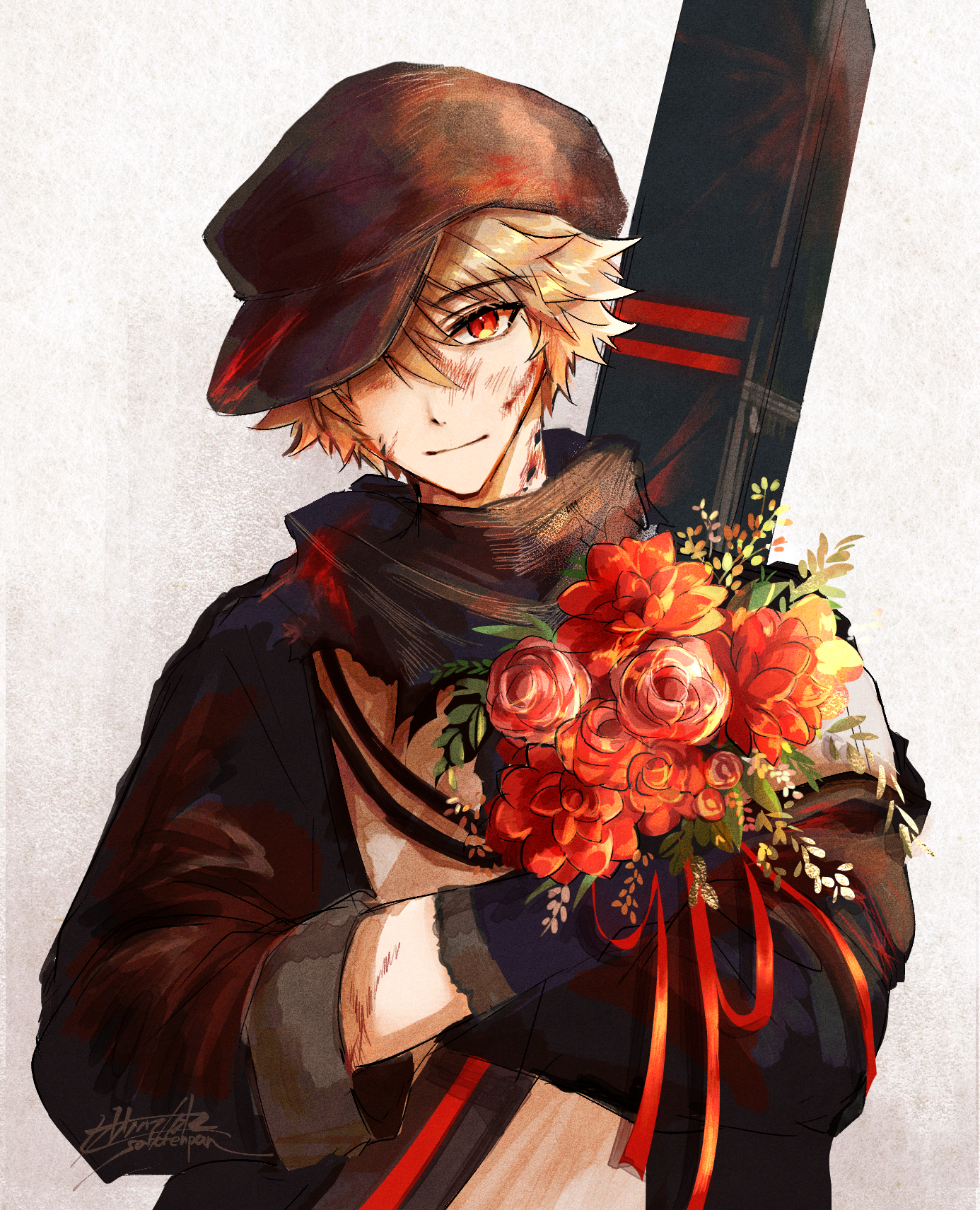 1boy arknights black_gloves black_hat black_jacket blood blood_on_face bouquet newsboy_cap closed_mouth flower gloves grey_background hair_between_eyes hat highres holding holding_bouquet jacket light_brown_hair looking_at_viewer male_focus oonohara_kenya open_clothes open_jacket red_(npc)_(arknights) red_eyes red_flower red_rose rose shirt simple_background smile solo upper_body white_shirt