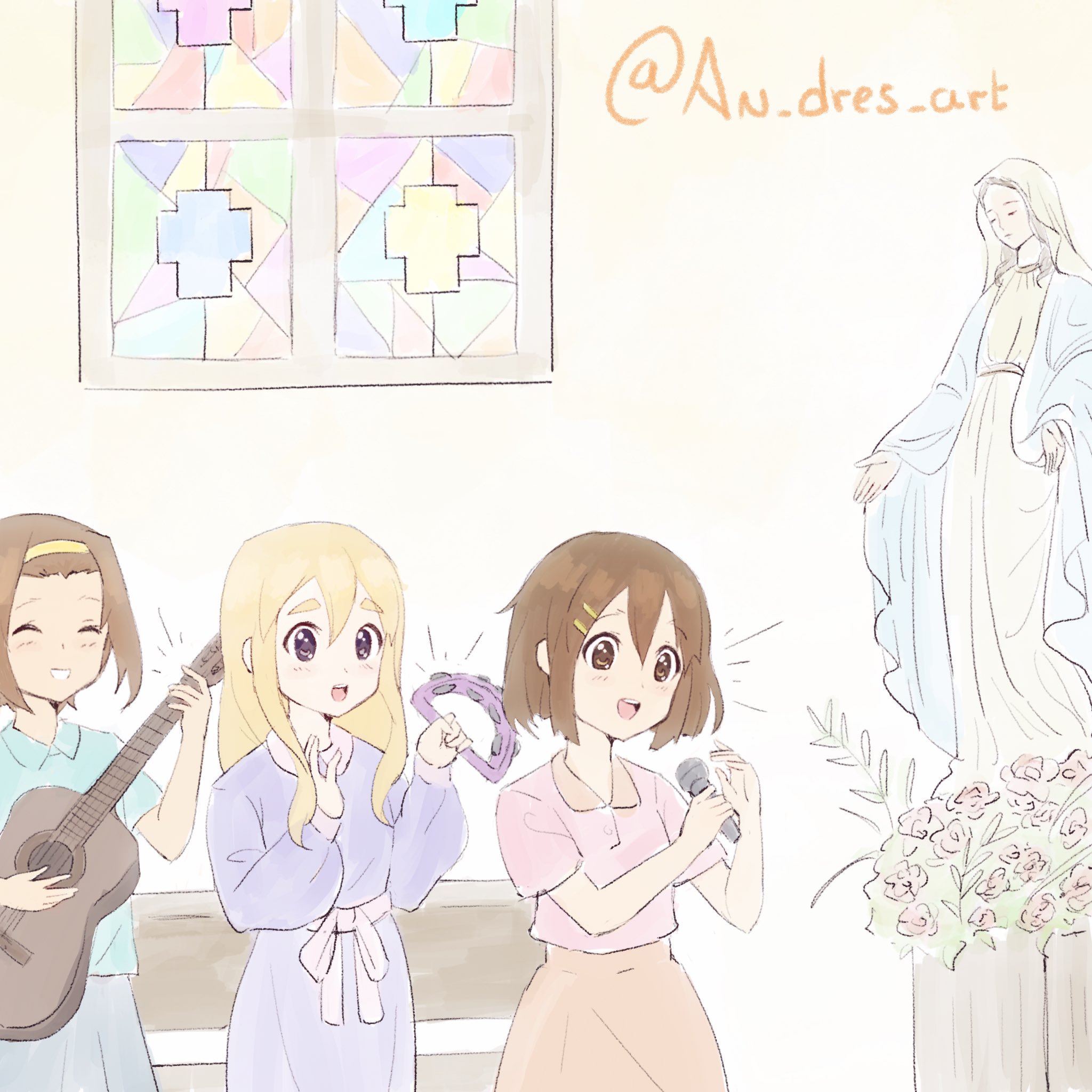 an_dres_art bangs_pinned_back blonde_hair blue_eyes blue_shirt brown_eyes brown_hair dress flower guitar hair_between_eyes hair_ornament hairband hairclip highres hirasawa_yui indoors instrument k-on! kotobuki_tsumugi long_hair microphone music orange_skirt pew pink_shirt playing_instrument purple_dress shirt short_hair sidelocks singing skirt smile statue tainaka_ritsu tambourine thick_eyebrows virgin_mary window yellow_hairband
